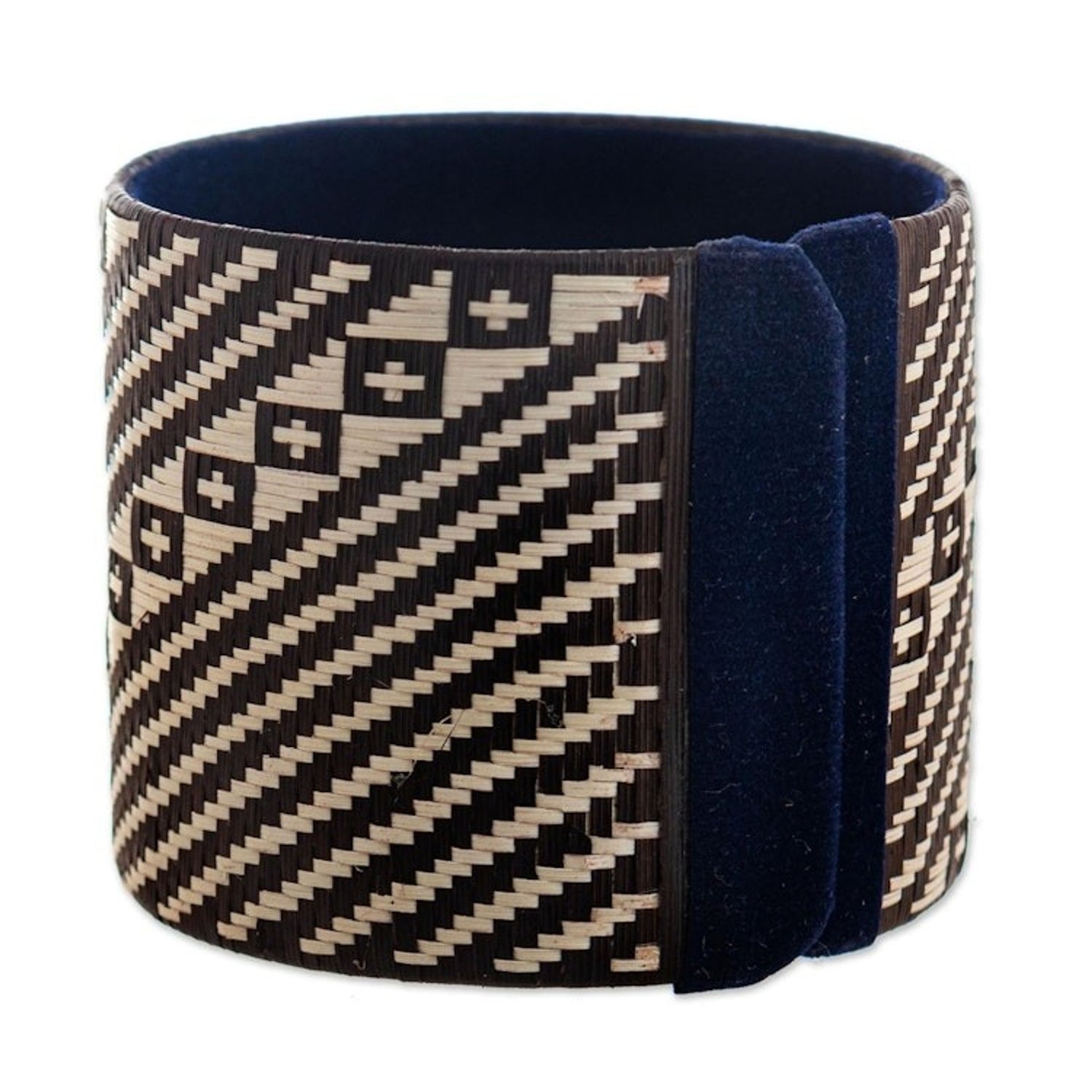 Handcrafted from caña flecha fiber, PVC, and polyester, this cuff bracelet measures 7 inches L (end to end) x 2 inches W.