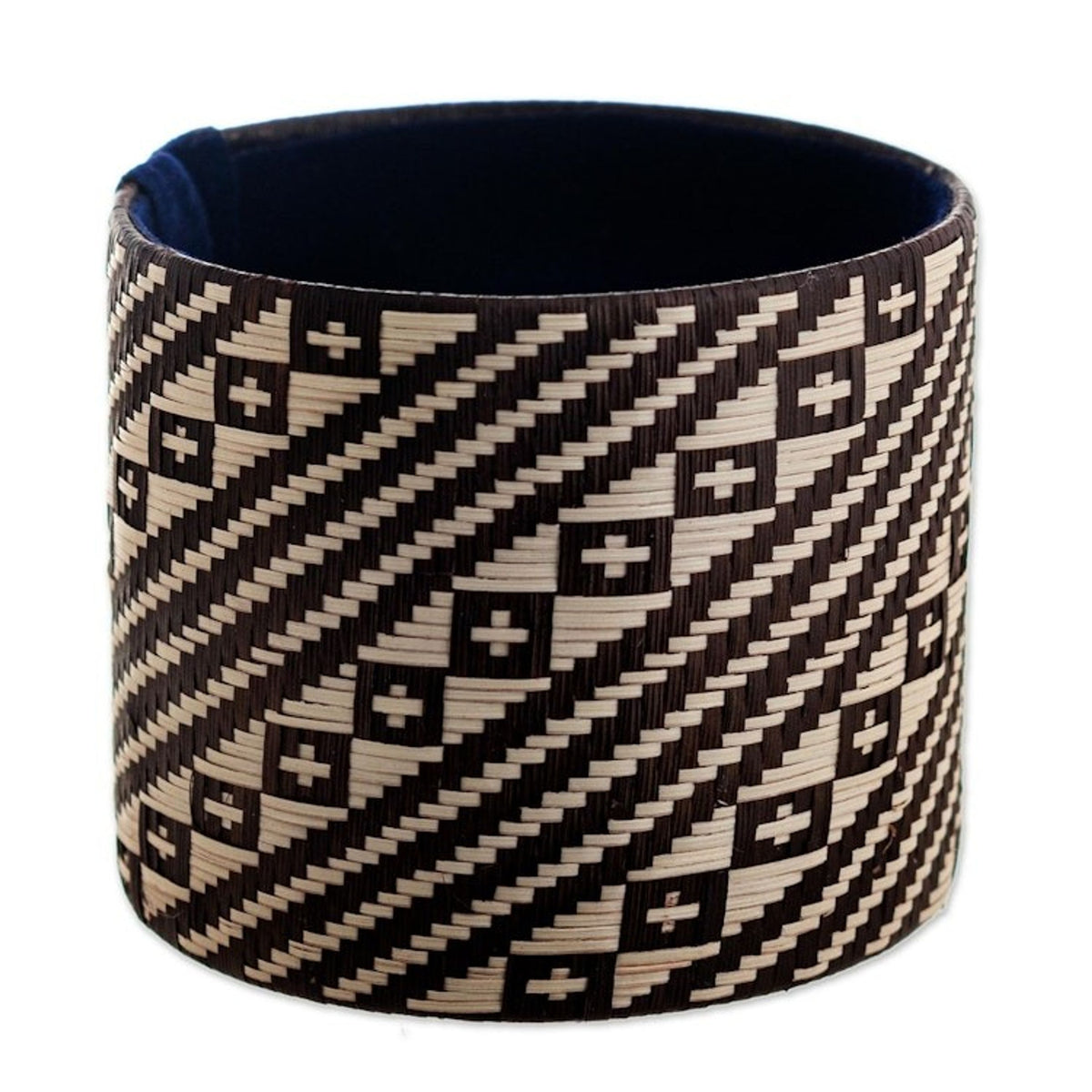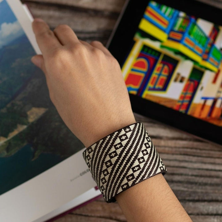 This Wide Natural Fiber Cuff Bracelet 'The Way of the Cross' by Independent Artisans is a dramatic and culturally significant accessory. Created by the artisans of the Zenú Community in northwest Colombia, this cuff bracelet is meticulously woven from caña flecha fiber, a native neotropical grass. The geometric patterns, or pintas, carry symbolic meaning, representing ancestral narratives. Each piece honors their land, their stories, and their identity, inviting wearers to carry a piece of Colombia's living tradition.
