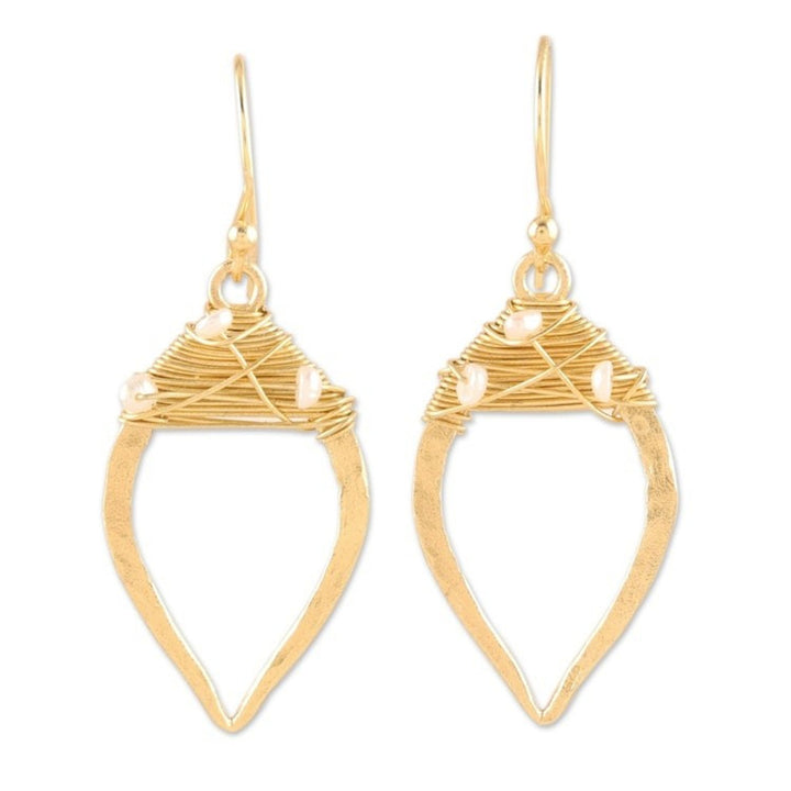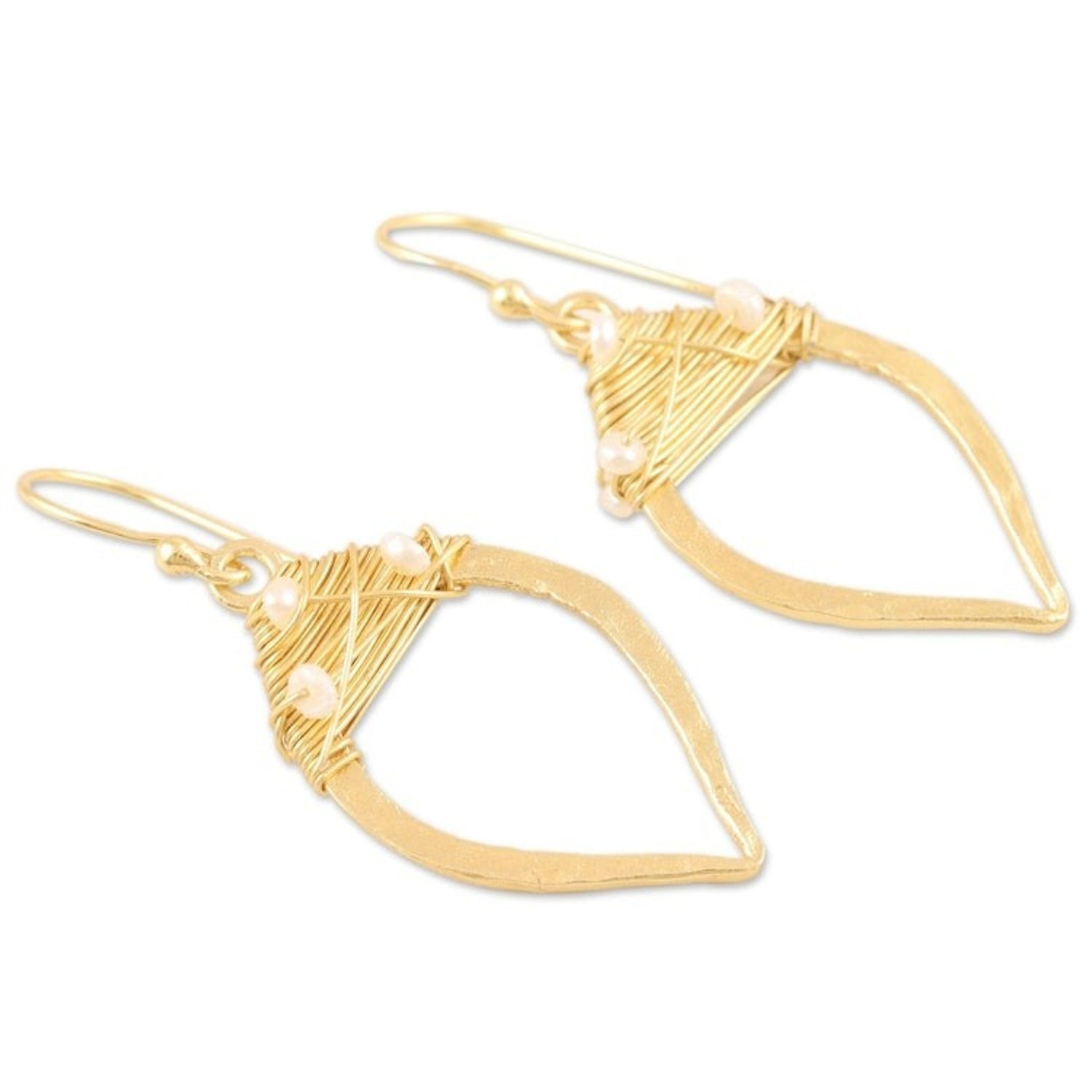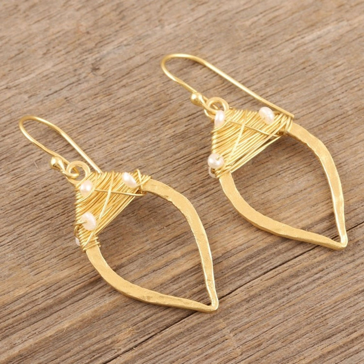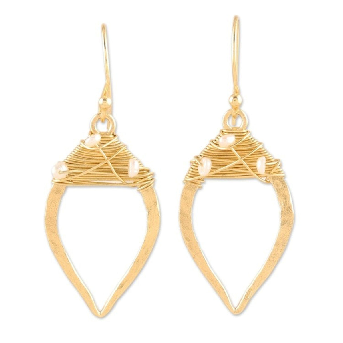 These Wire-Wrapped 22k Gold Plated Earrings 'Voice of the Sea' by Independent Artisans are an artful blend of heritage and creativity. Designed by Vivek Nathany, an Indian designer who was captivated by the beauty of handcrafted silver, these dangle earrings are shaped like conch shells and glisten with 22k gold-plated sterling silver. They are wrapped with gold-plated wire strung with tiny white cultured pearls, making them a piece that is distinguished by delicate detailing and inspired by jewelry traditions from around the world.