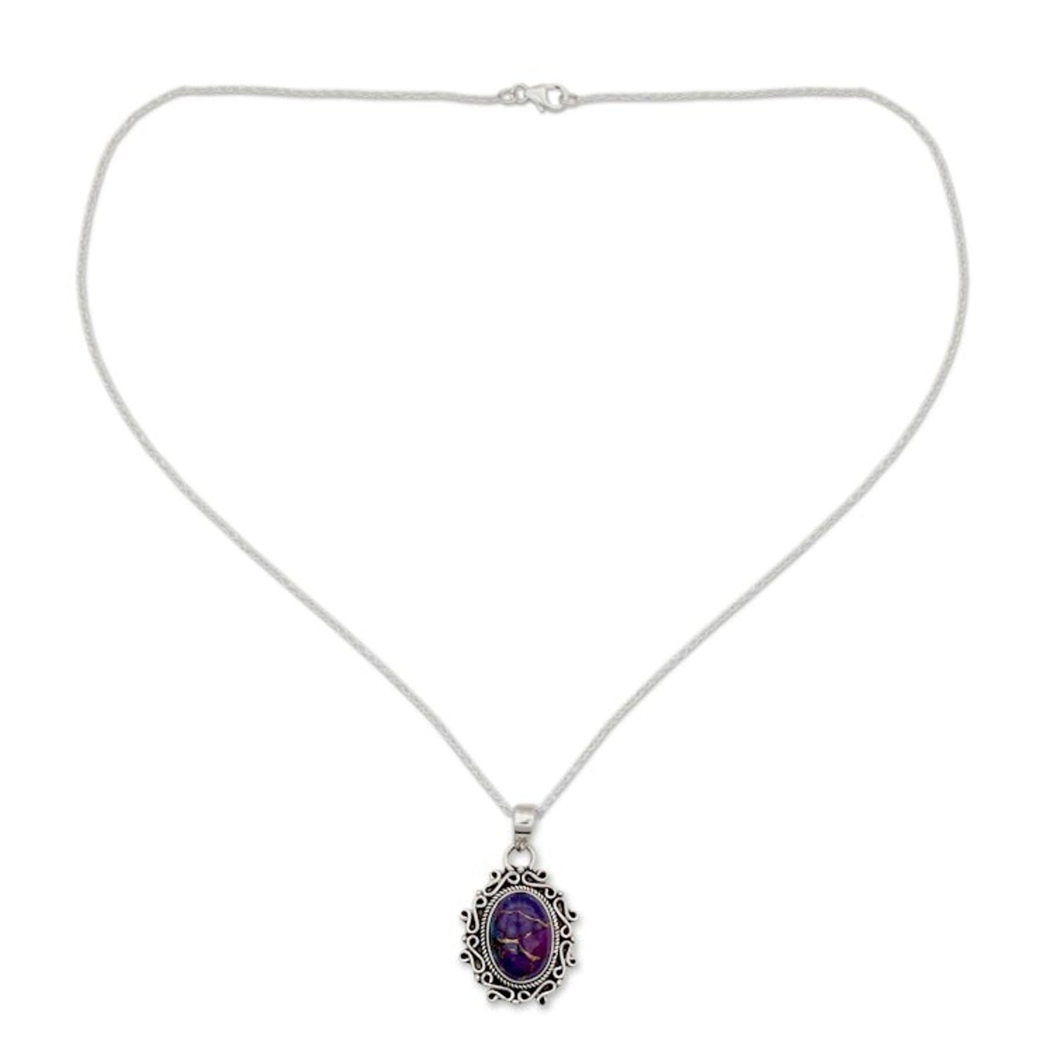 This Women's Sterling Silver Necklace Composite Turquoise Jewelry 'Splendor' by Independent Artisans is an enchanting piece that reflects a shared dream of artistry and devotion. Designed by Aparna, an Indian artisan, this handcrafted necklace features a glowing purple composite turquoise gemstone surrounded by a sterling silver halo. The design blends the rich heritage of Jaipur with contemporary forms, creating a necklace that embodies resilience and timeless beauty.