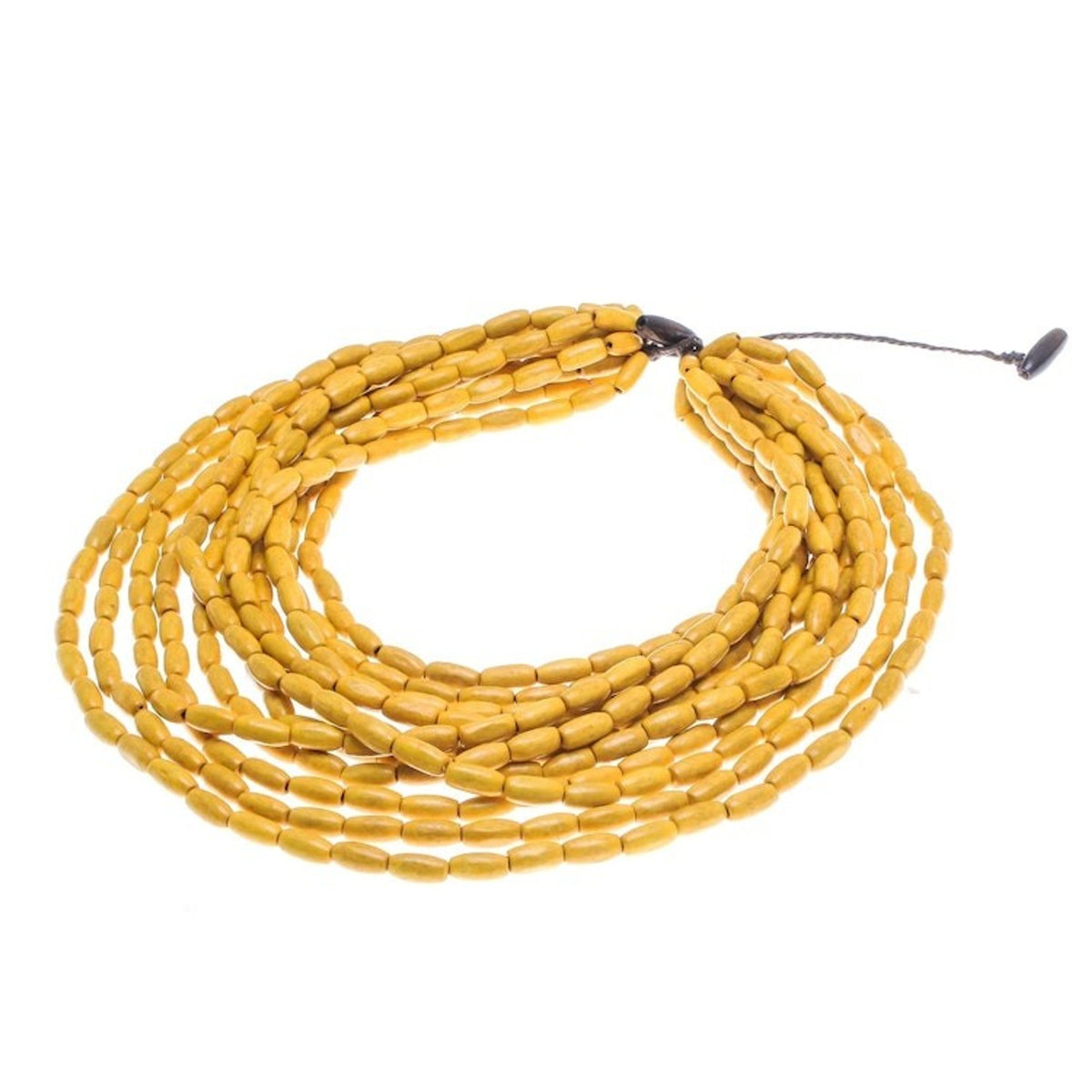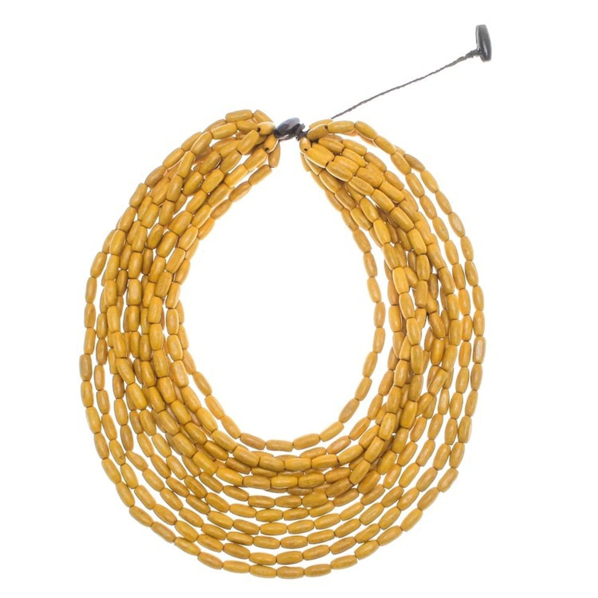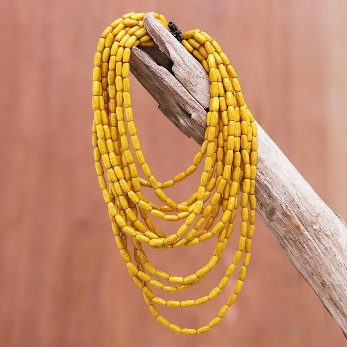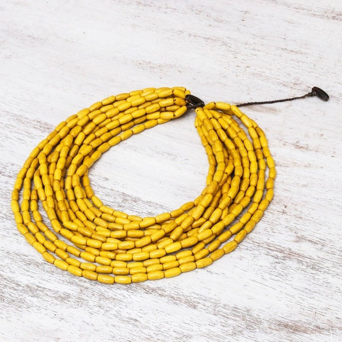 This Wood Beaded Strand Necklace in Maize from Thailand 'Cute Boho in Maize' by Independent Artisans is a charming accessory with a boho touch. Designed by Sumalee Nawakul, this necklace circles the neck with nine strands of haldu wood beads in a maize color. The design transforms humble beads into a vibrant piece of jewelry that is both affordable and beautiful, celebrating the artisan's journey and her dedication to uplifting her community.