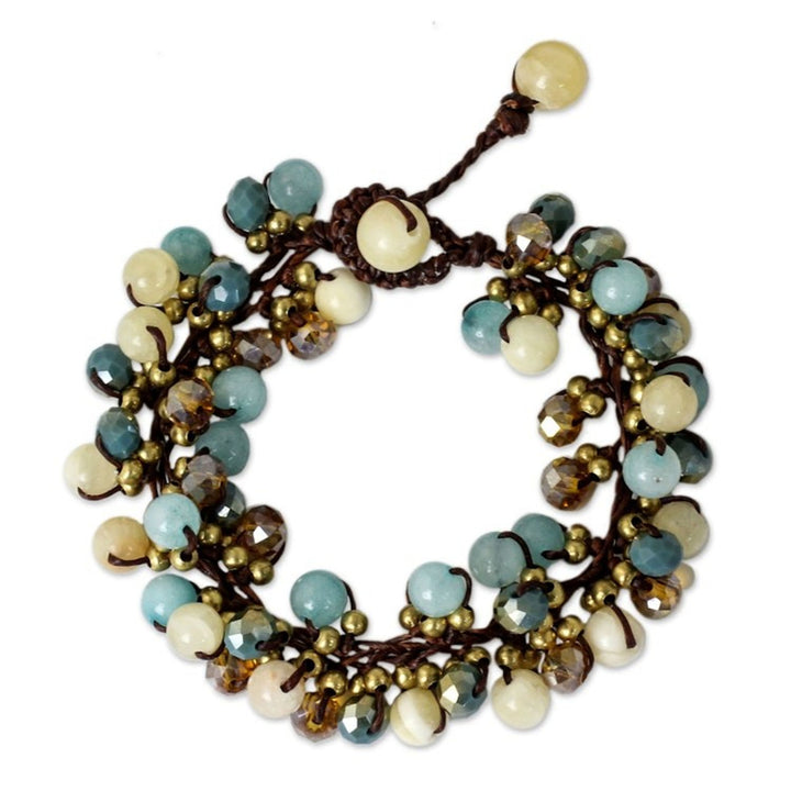 Handcrafted from dyed quartz, glass, and brass beads on polyester, this bracelet has an adjustable length from 6.3 to 7 inches and closes with a button clasp.