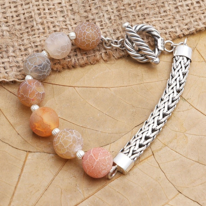 This Agate and Sterling Silver Beaded Bracelet 'Sensations' by Ketut Sulastri is a one-of-a-kind bracelet with an asymmetrical design. Designed by a Balinese artisan, this beaded bracelet uses smooth agate beads on half the bracelet, accenting the gems with sterling silver beads. A sterling silver naga chain completes the second half, and an elegant toggle clasp finishes the piece, which reflects the intricate beauty of Balinese arts and crafts.