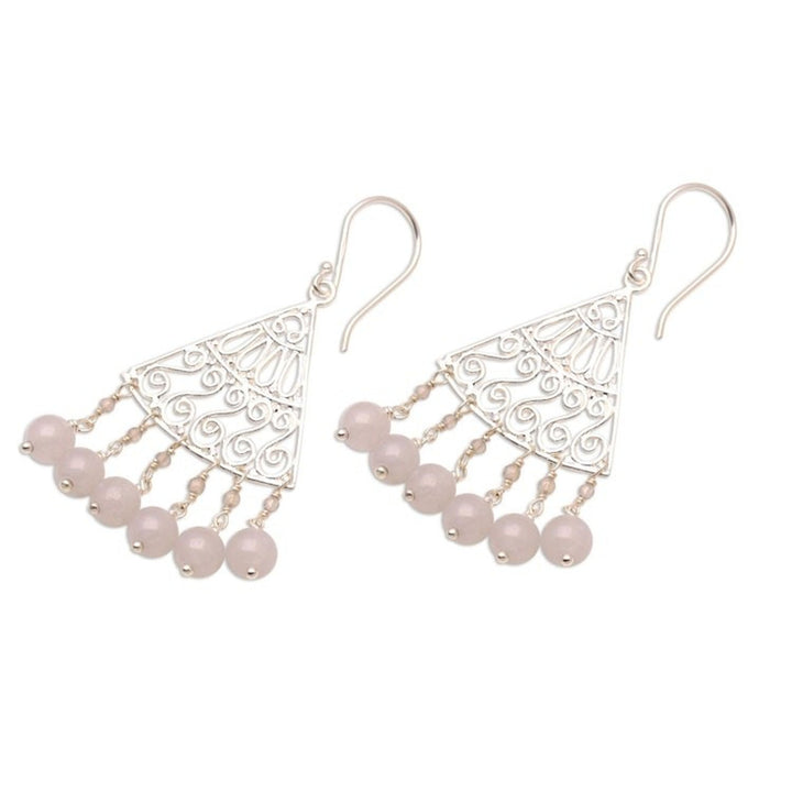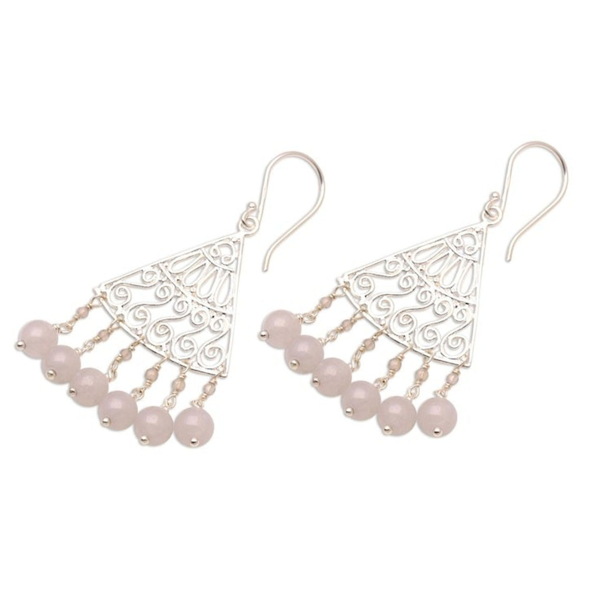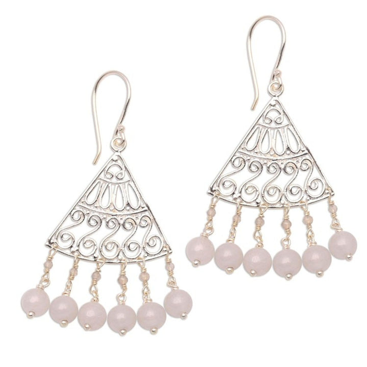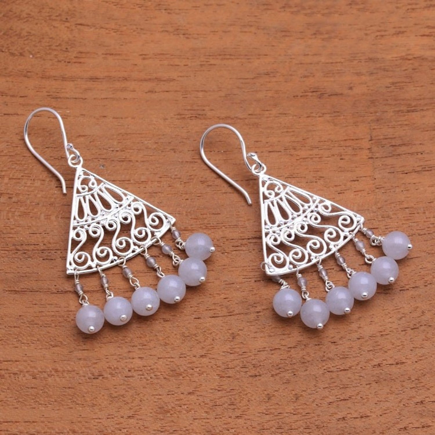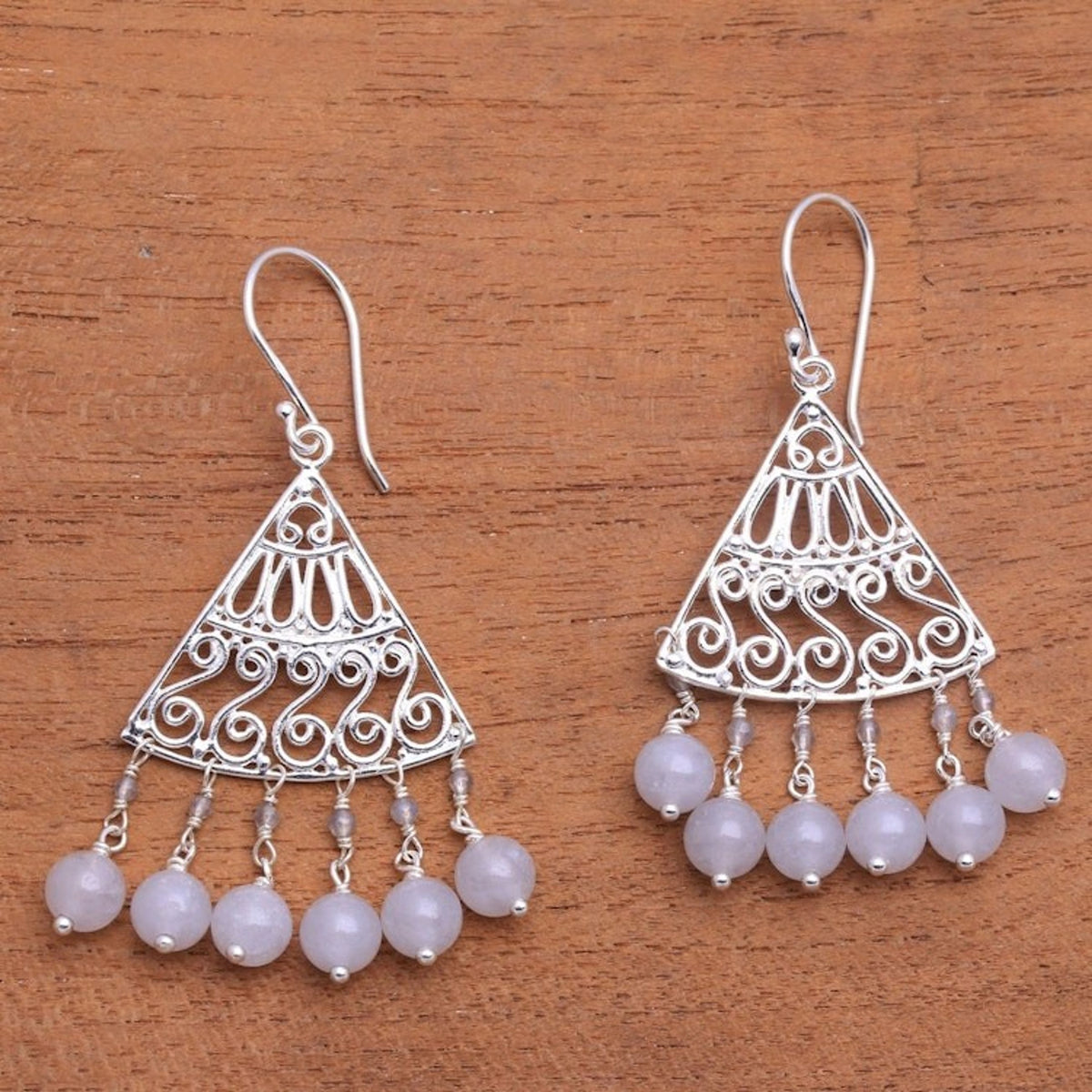 These Spiral Pattern Moonstone Chandelier Earrings from Bali 'Spiral Fascination' by Ketut Sulastri are gleaming and fascinating. The artisan works with sterling silver, crafting each earring in a triangular fan shape to display spirals and intricate openwork. A chandelier of moonstone beads dangles from the earrings, which are a beautiful blend of tradition and contemporary sensibility.