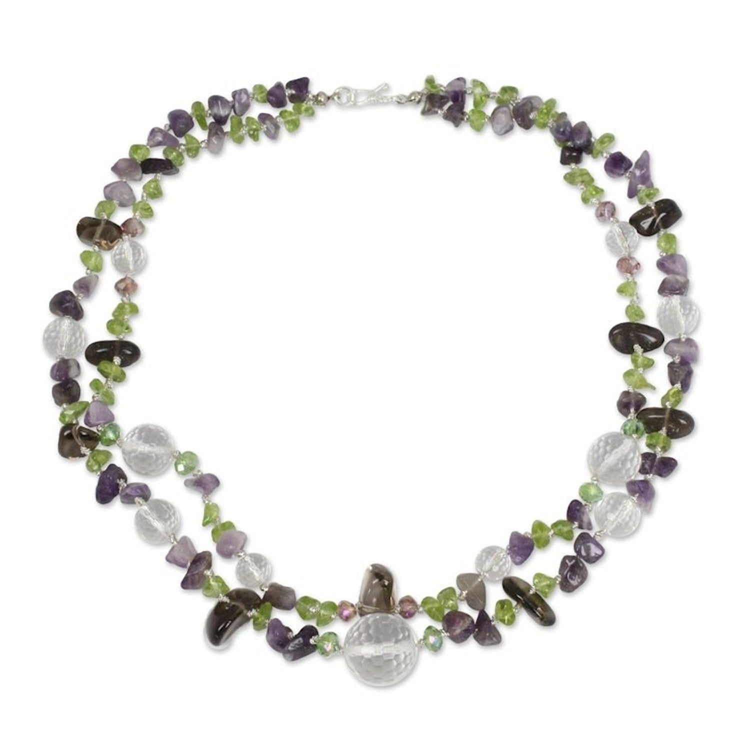 This Artisan Crafted Peridot Quartz and Amethyst Necklace 'Lilac Garden' by Kittima Ekmahachai is a beautiful double-strand necklace that calls to mind fragrant bunches of lilac blooms. Designed by a Thai artisan, this necklace features polished chips of amethyst and peridot that are joined by freeform smoky quartz stones and brilliantly faceted clear quartz globes. The necklace is completed with a clasp of fine Thai silver and is meant to inspire joy and appreciation.