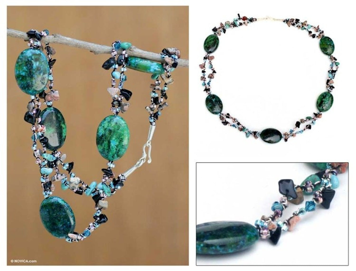This Handcrafted Gemstone Necklace in Turquoise Colors 'Magical Enchantment' by Kittima Ekmahachai is a beautiful necklace with strands of colorful gemstones. The necklace combines serpentine, unikite, and reconstituted turquoise with diminutive beads, and sleek blue-green ovals link them together. The piece is crafted from local materials and is meant to inspire joy and appreciation.