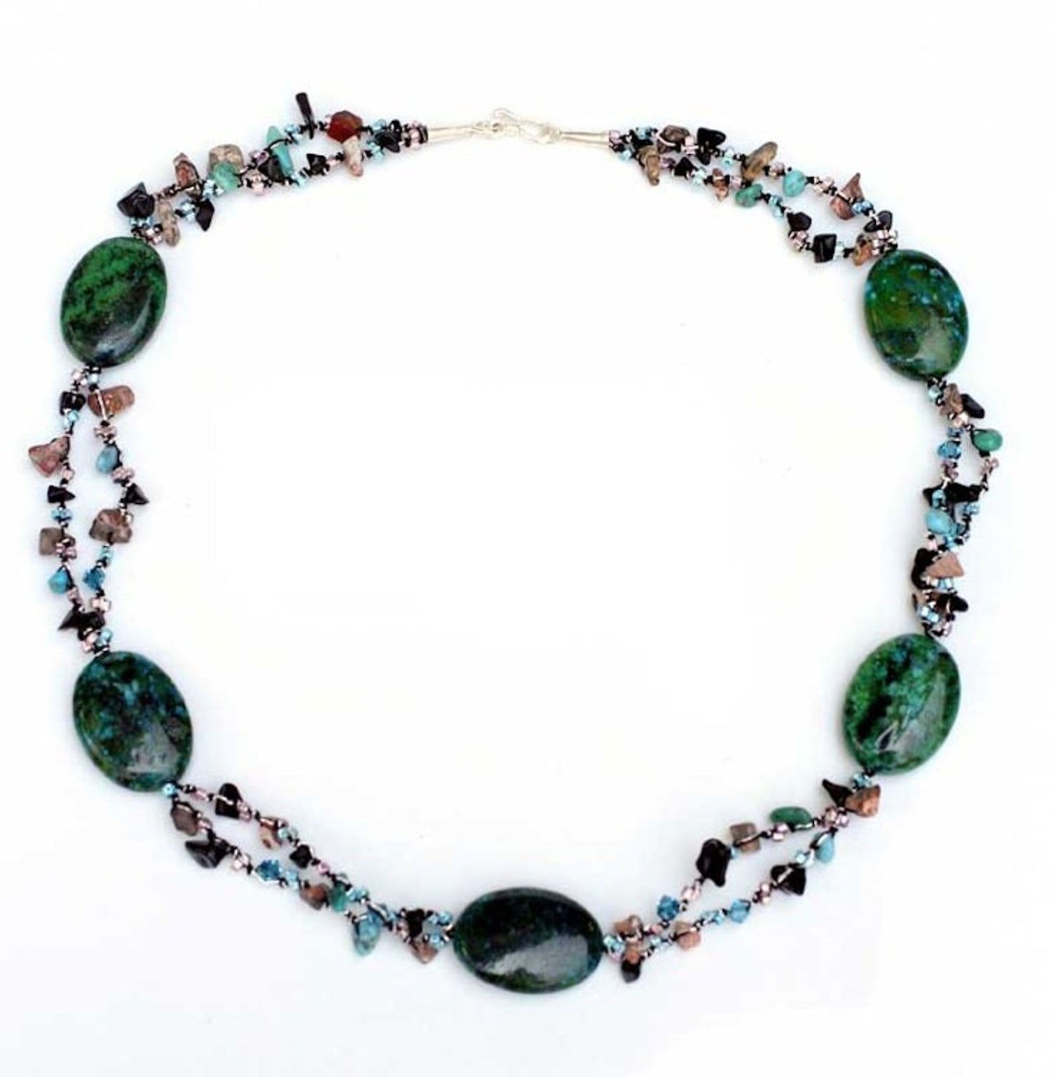 Handcrafted from sterling silver, serpentine, reconstituted turquoise, unakite, and glass with a high polish finish, this necklace measures 19.3 inches in length and closes with an S-hook or hook clasp.