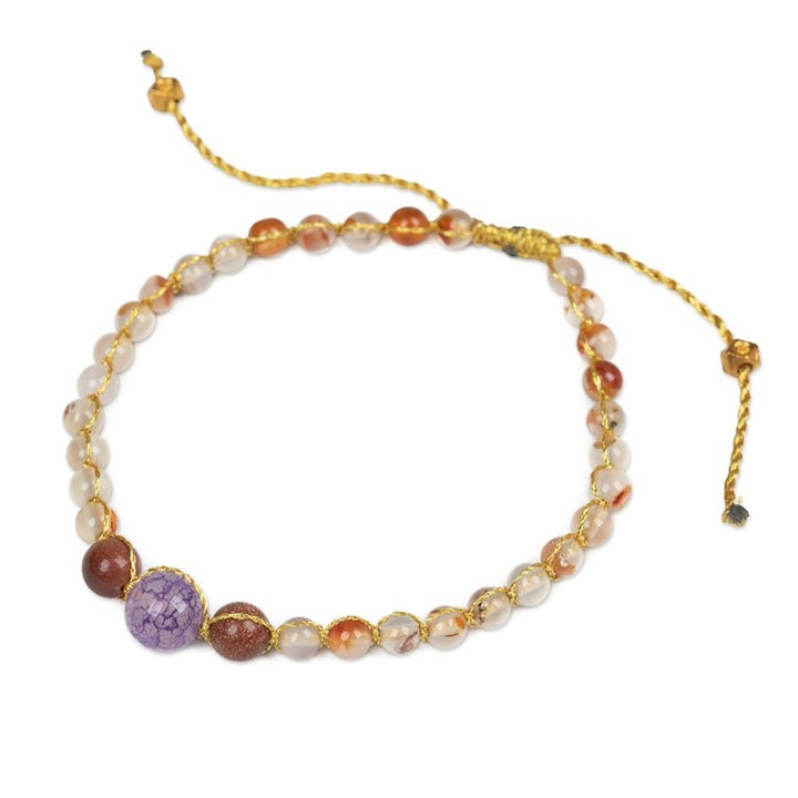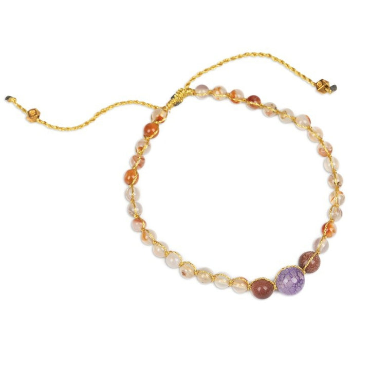 Handcrafted from chalcedony, sandstone, amethyst, polyester cord, and 18k gold-plated brass beads, this adjustable bracelet has a length that varies from 7 to 10.3 inches and closes with a sliding knot.