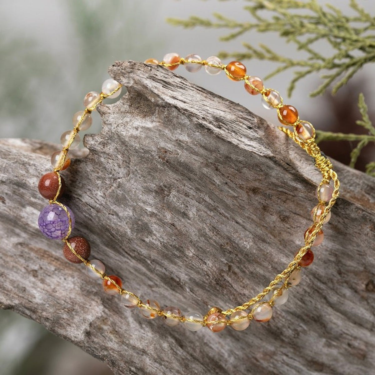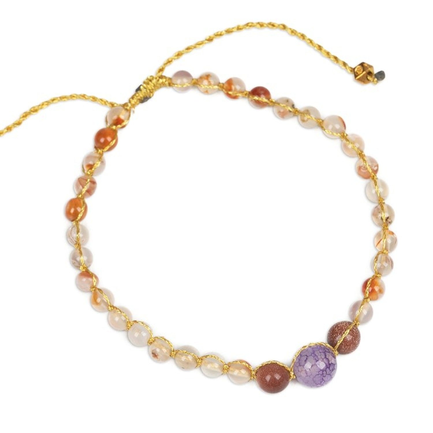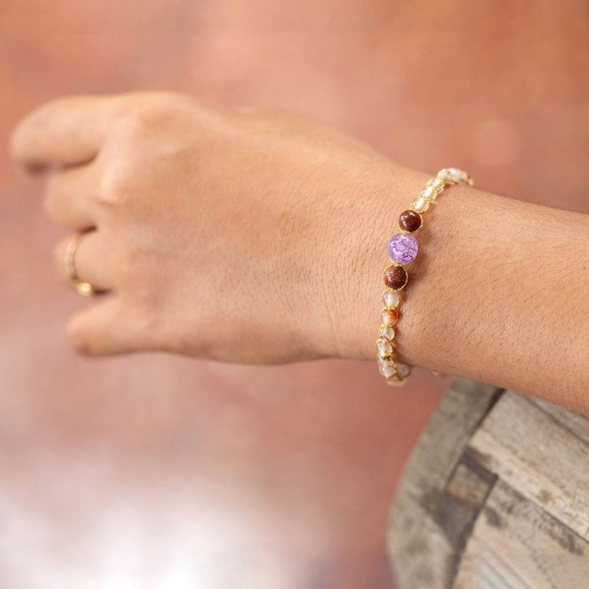 This Balinese-Made Golden Chalcedony and Amethyst Beaded Bracelet 'Wise Healing' by Made Masna has a centered amethyst stone that spreads its wise aura. Golden polyester cords join chalcedony and sandstones around the purple gem, creating a stunning combination of colors. 18k gold-plated brass beads decorate the sliding knot, and the bracelet is a beautiful tool for well-being.