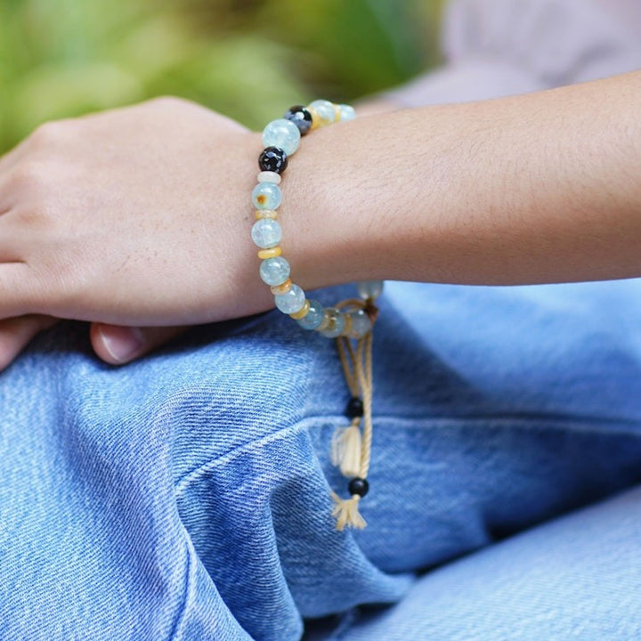 Handcrafted from polyester cords, aquamarine, obsidian, and beryl, this adjustable bracelet has a length that varies from 7 to 10.3 inches and closes with a sliding knot.
