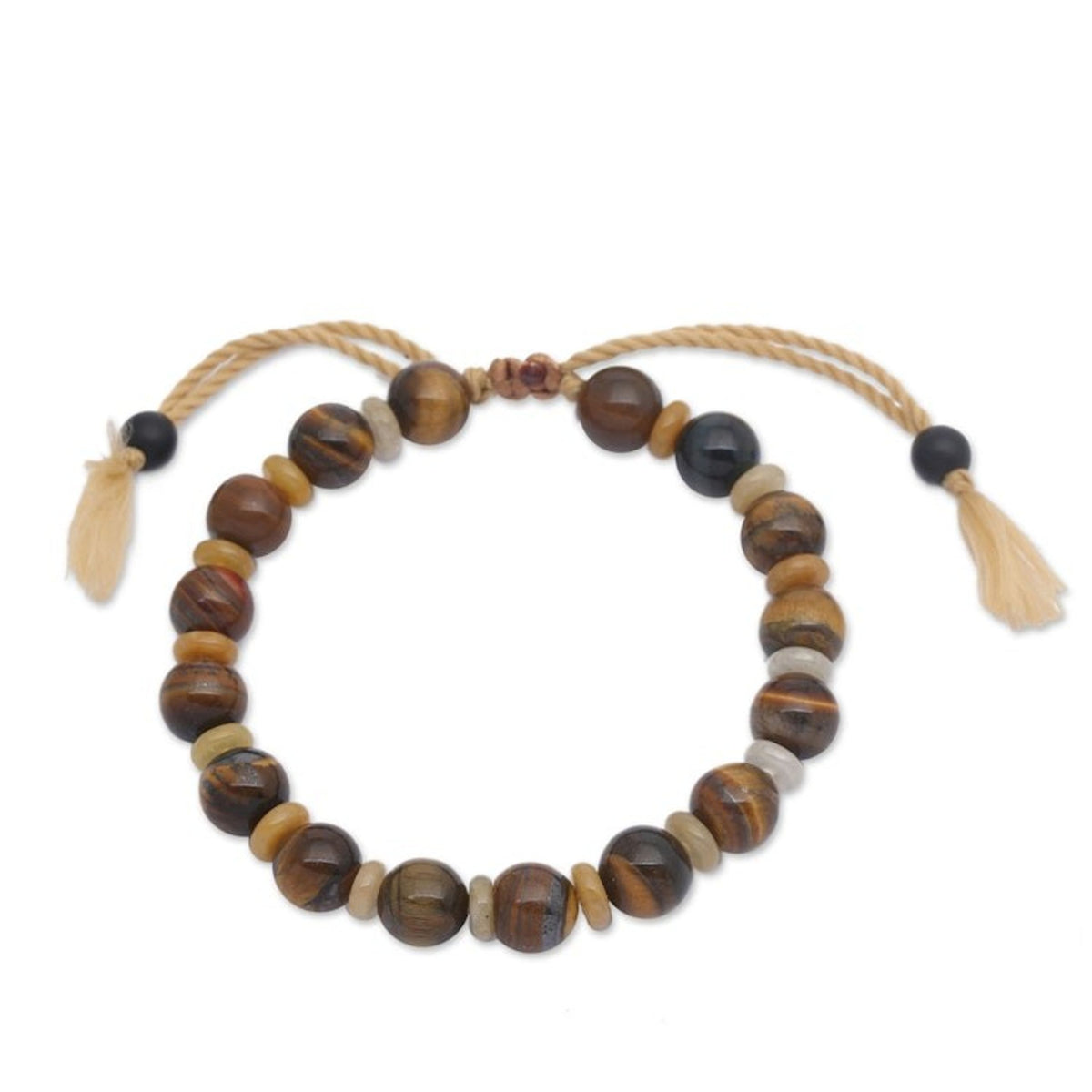 Handcrafted from tiger's eye, beryl, onyx, and a polyester cord, this adjustable bracelet has a length that varies from 7 to 10.3 inches and closes with a sliding knot.