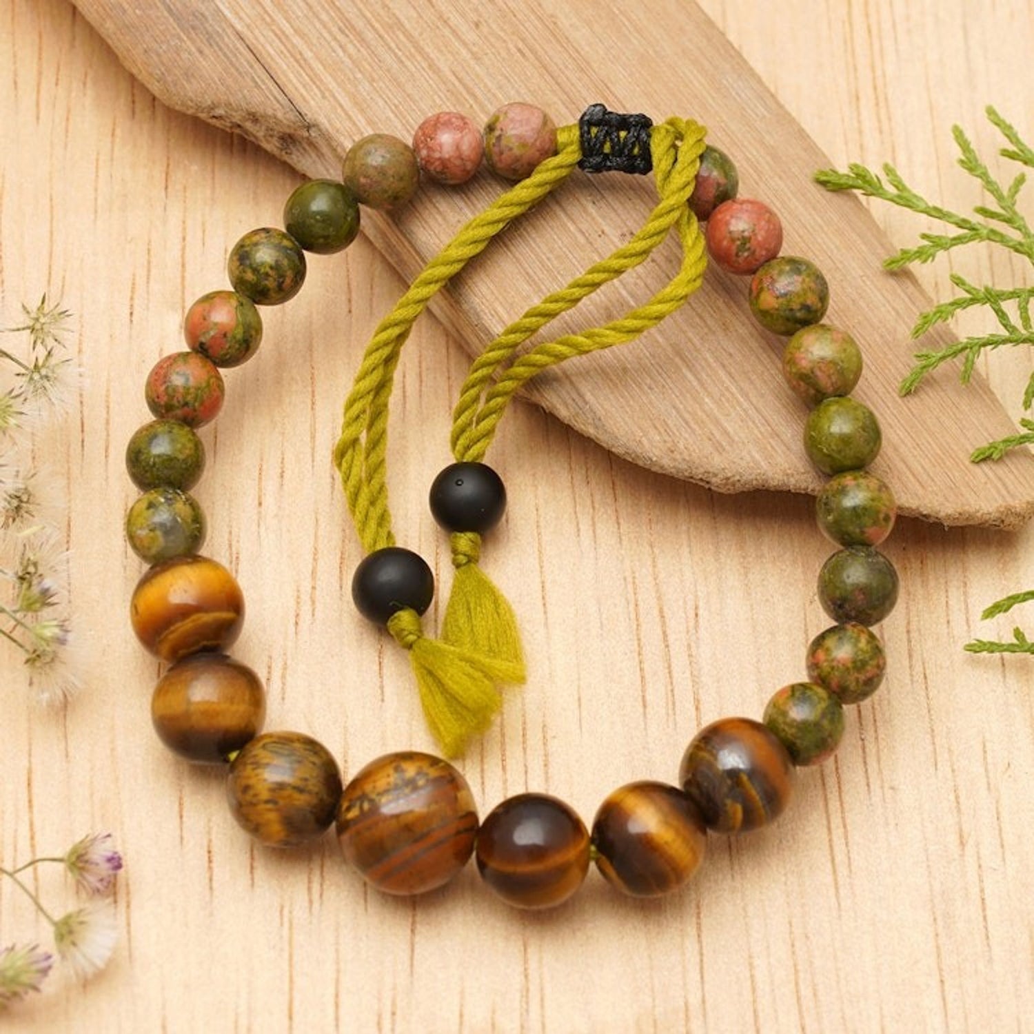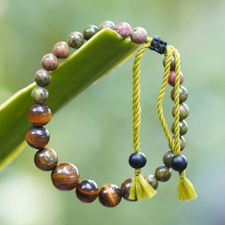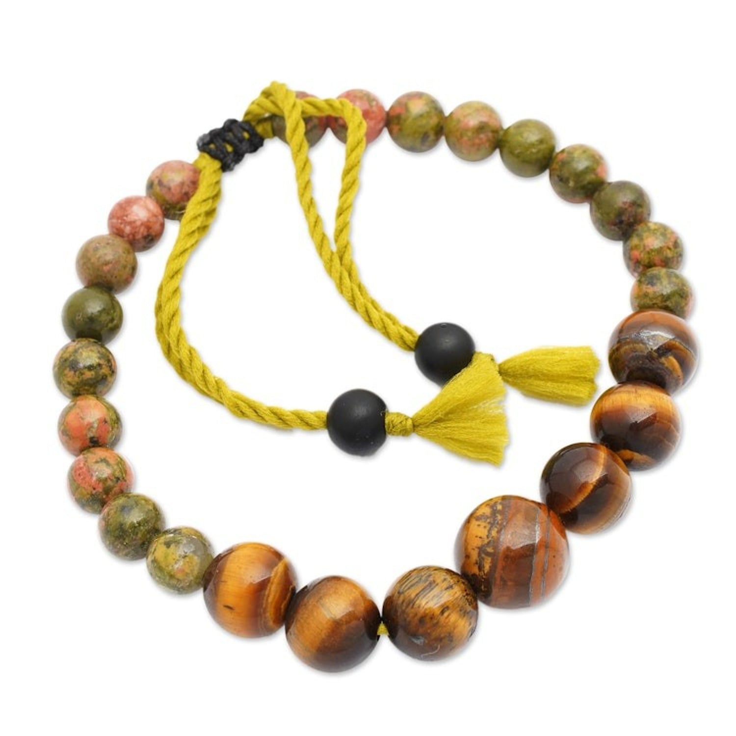 Handcrafted from unakite, tiger's eye, and polyester cords, this adjustable bracelet has a length that varies from 7 to 10.3 inches and closes with a sliding knot.