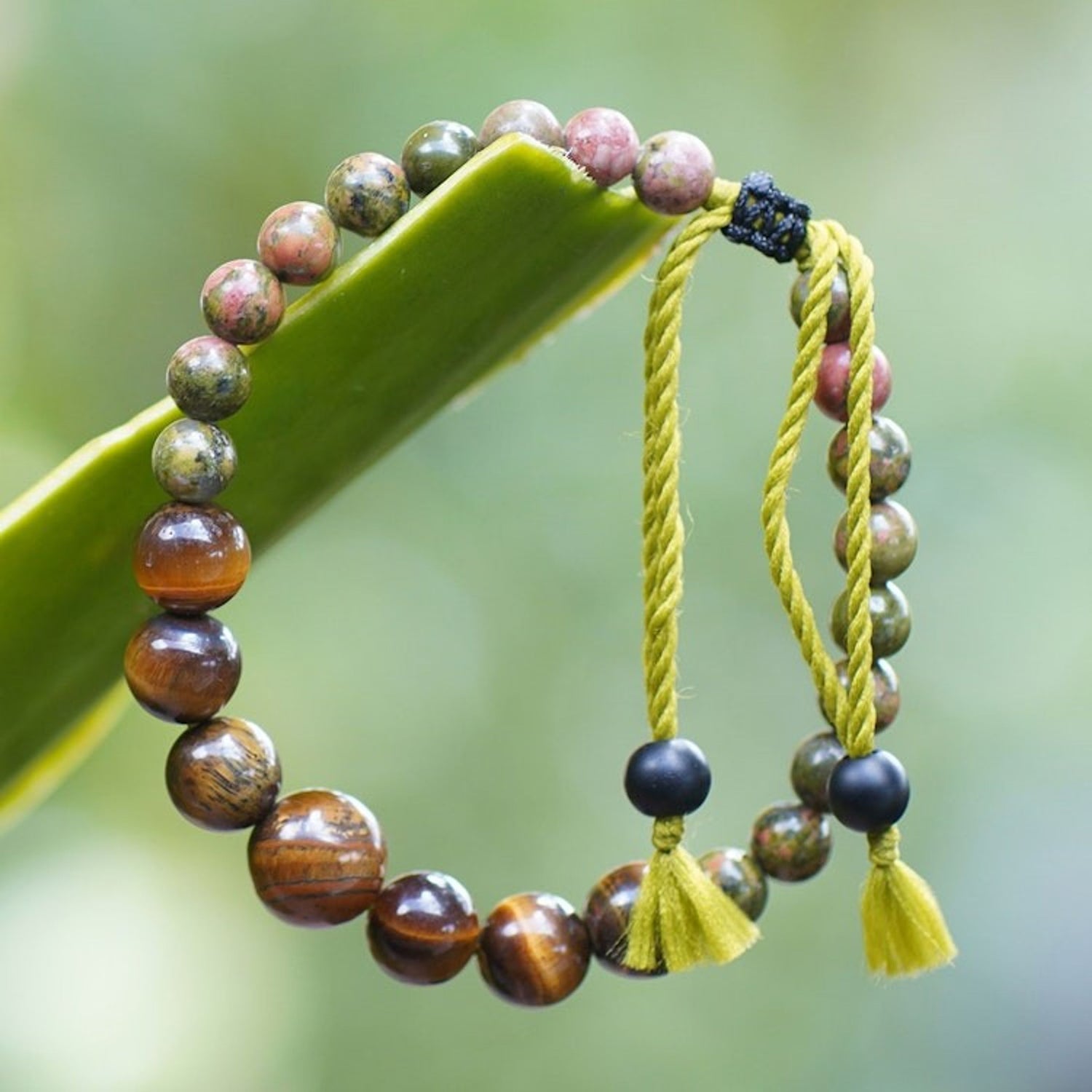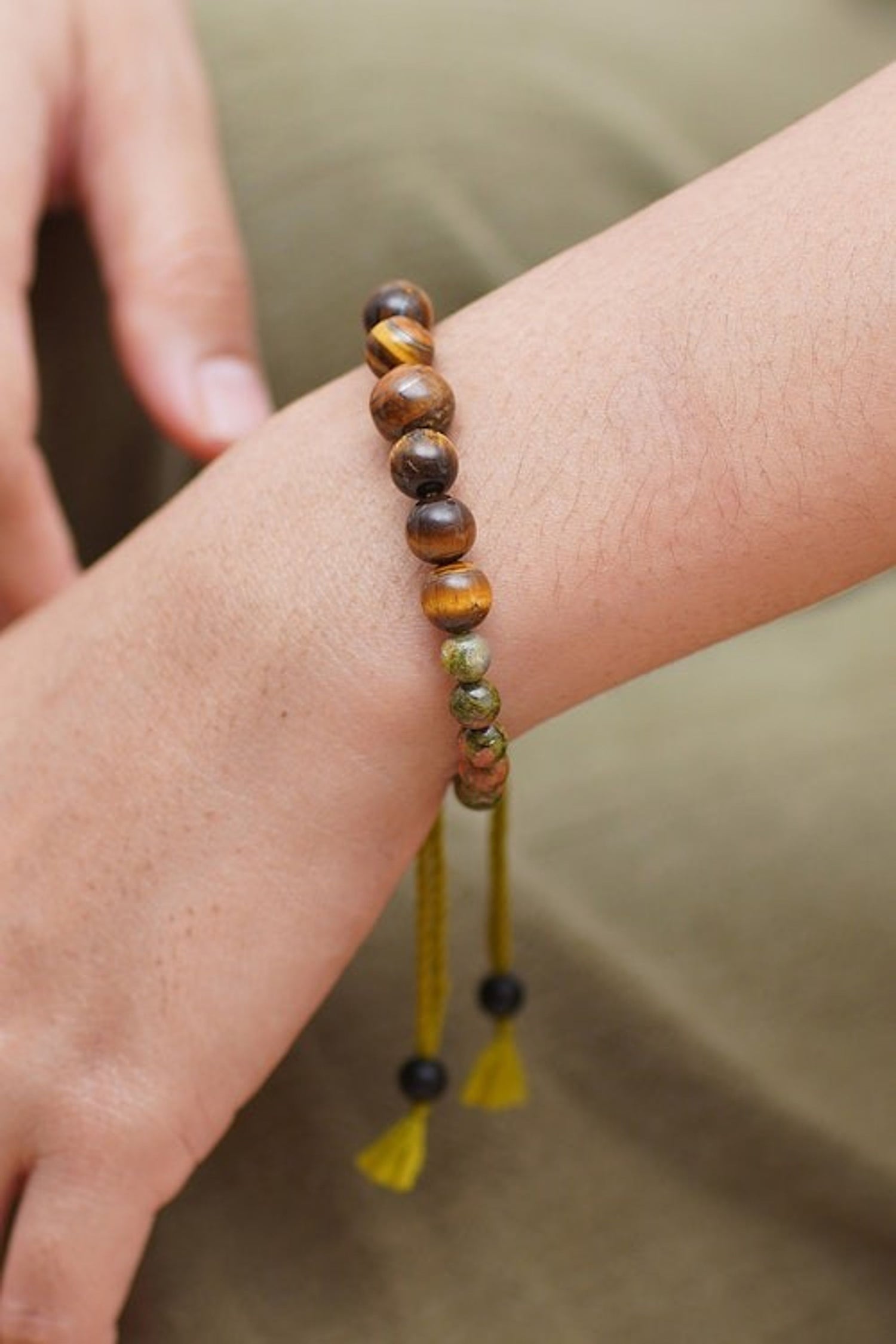 This Bohemian Unakite and Tiger's Eye Beaded Bracelet from Bali 'Visions of Courage' by Made Masna is an amulet of courage and clairvoyance. The piece features a palette of brown and green hues from unakite and tiger's eye beads. The bracelet has an adjustable sliding knot, and it shares a philosophy of harmony, resilience, and gratitude.