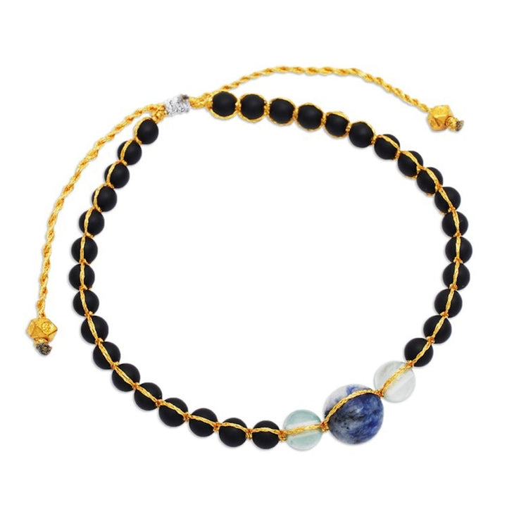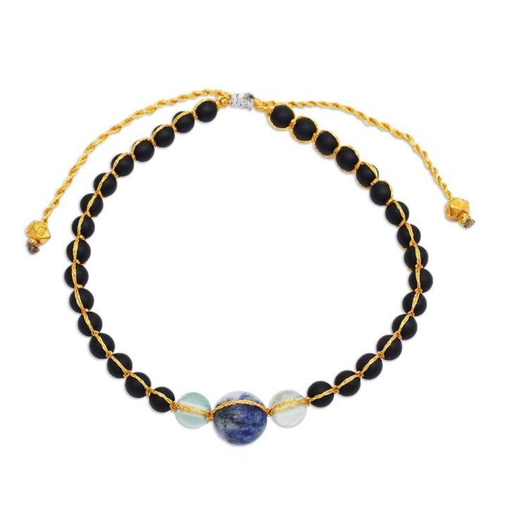 Handcrafted from onyx, fluorite, sodalite, 18k gold-plated brass beads, and a polyester cord, this adjustable bracelet has a length that varies from 7 to 10.3 inches and closes with a sliding knot.