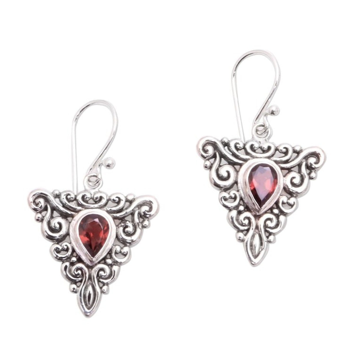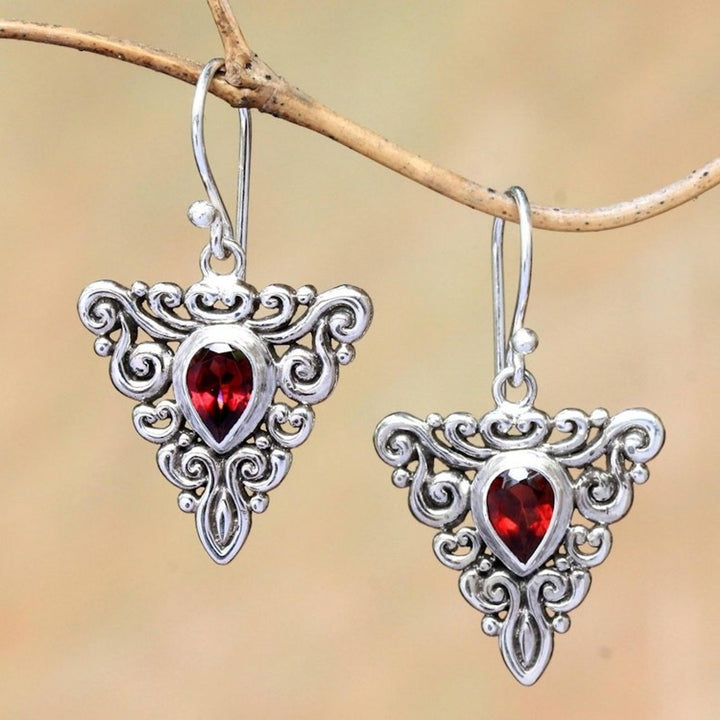 These Triangular Garnet Dangle Earrings from Bali 'Triangle Tendrils' by Made Mustika feature a unique design. Crafted of sterling silver, lovely tendrils form triangular shapes, with a faceted pear of natural garnet centering each one. The earrings reflect the artisan's personal resilience and dedication to his craft.