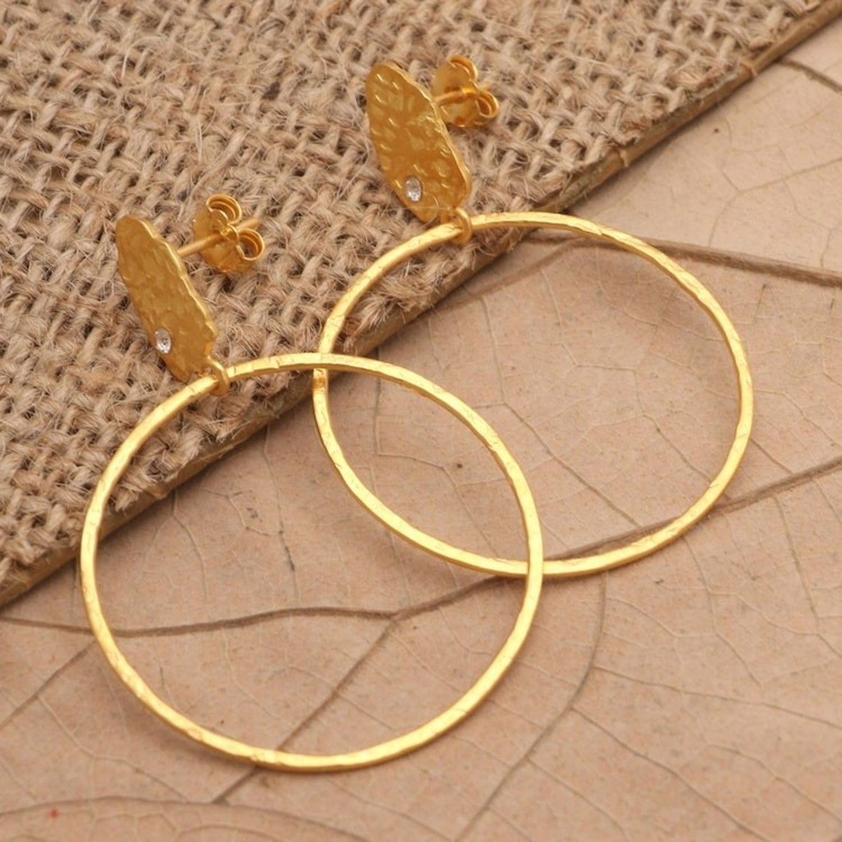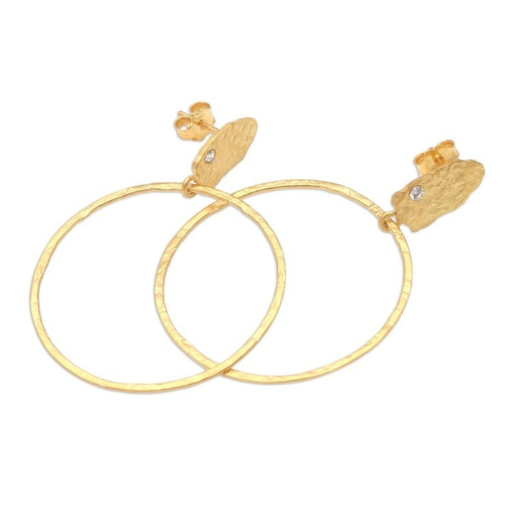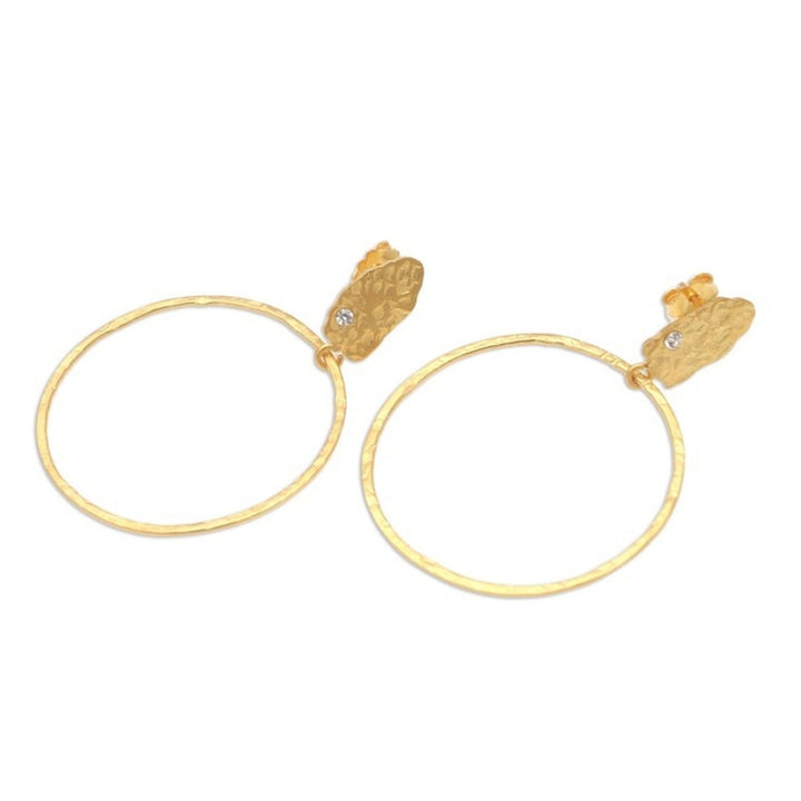 Handcrafted from 18k gold-plated 925 sterling silver and cubic zirconia with a hammered finish, these earrings measure 2 inches L x 1.4 inches W and feature post closures.
