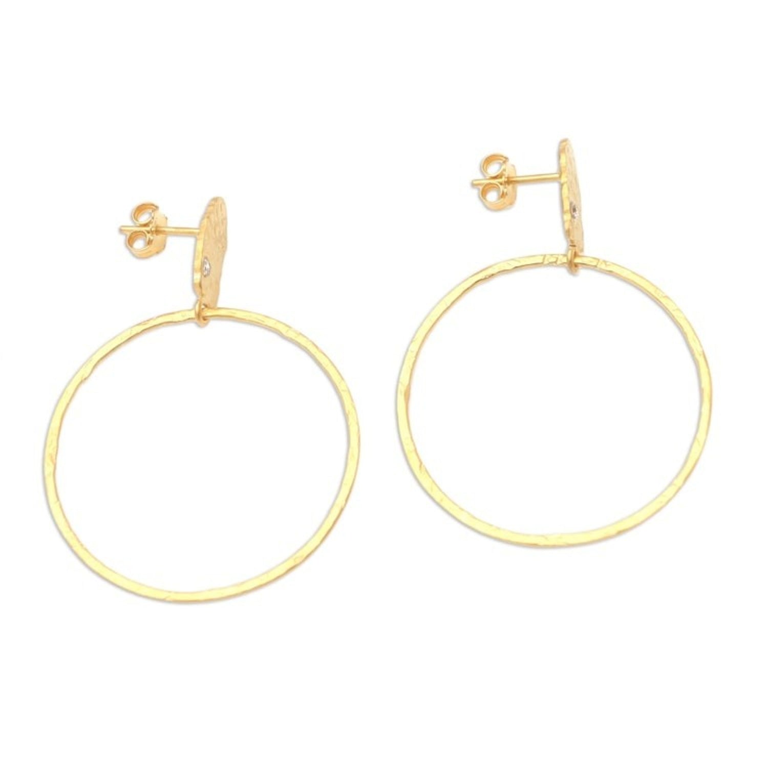 These Gold-Plated Cubic Zirconia Dangle Earrings 'Euphoria in Gold' by Made Siri will give you a reason to sparkle. The earrings are crafted from a narrow hoop of 18k gold-plated sterling silver in a subtle hammered finish, while a petite cubic zirconia gem accents the posts. The piece is a beautiful blend of fashion sensibility and Balinese craftsmanship.