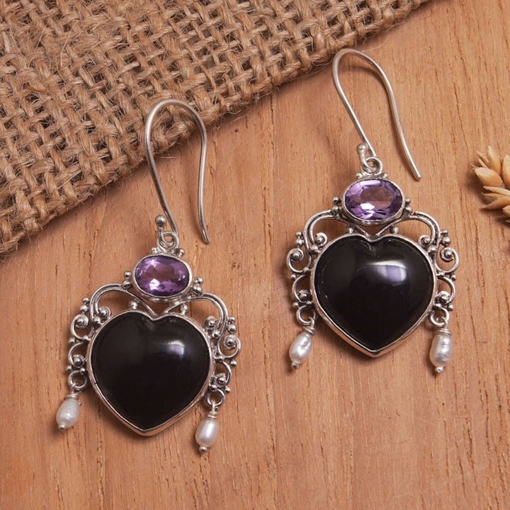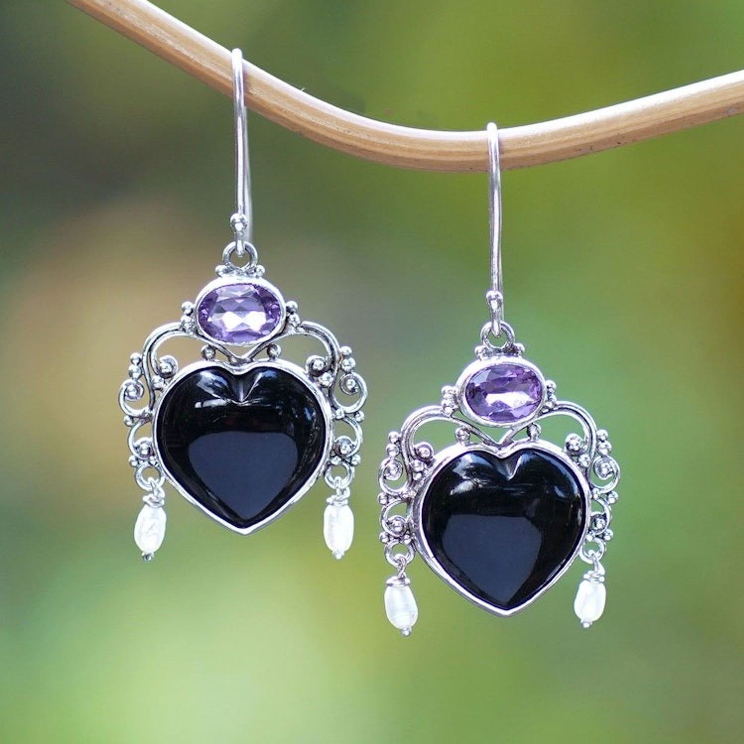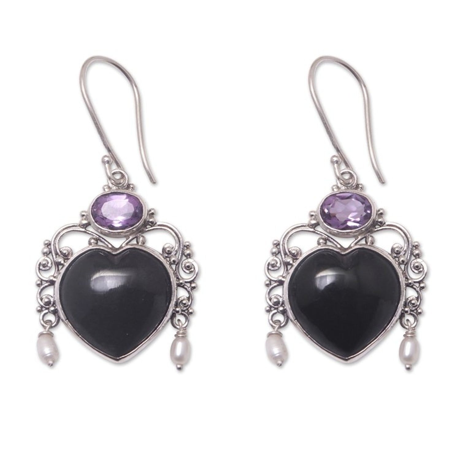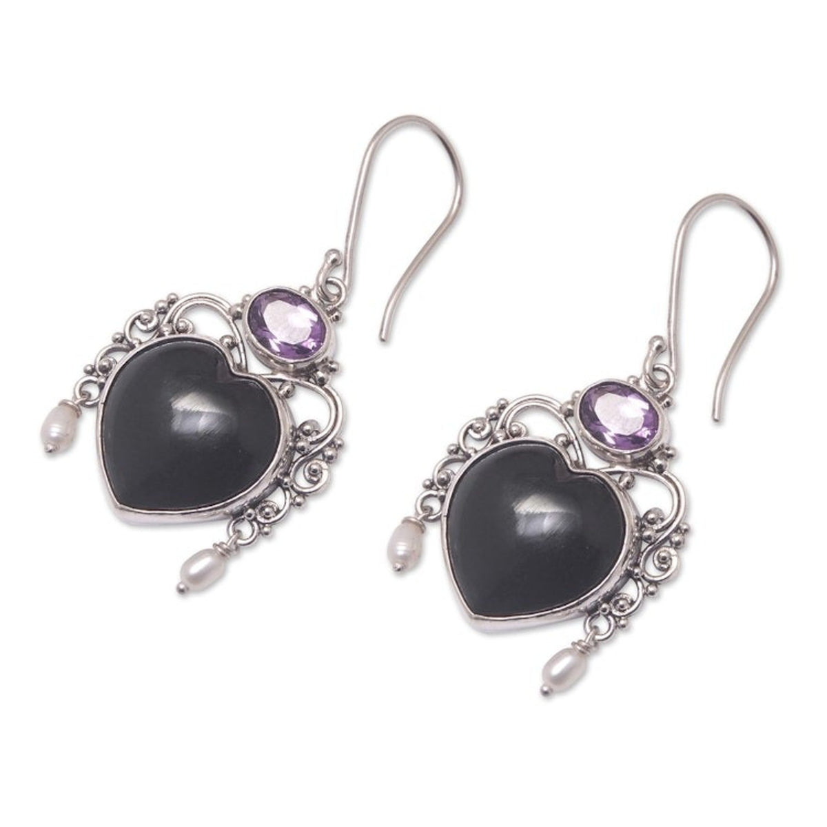 Amethyst and Cultured Pearl Heart Dangle Earrings from Bali 'Love Like Midnight'