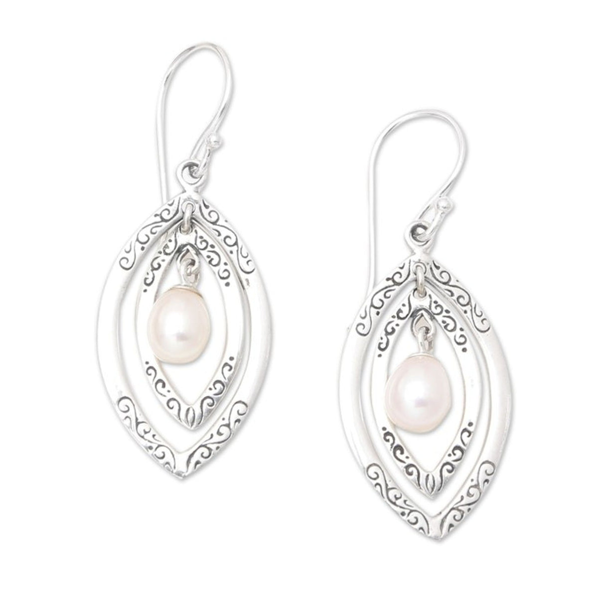 These Balinese Cultured Pearl and Sterling Silver Dangle Earrings 'Rare Entity' by Made Yuliawati are designed with gleaming silver and pale peach pearls. The dangle earrings are engraved with graceful swirls and are centered with a cultured freshwater pearl. Finally, a combination finish creates beautiful contrast. The piece embodies precision, balance, and the enduring spirit of Balinese artistry.