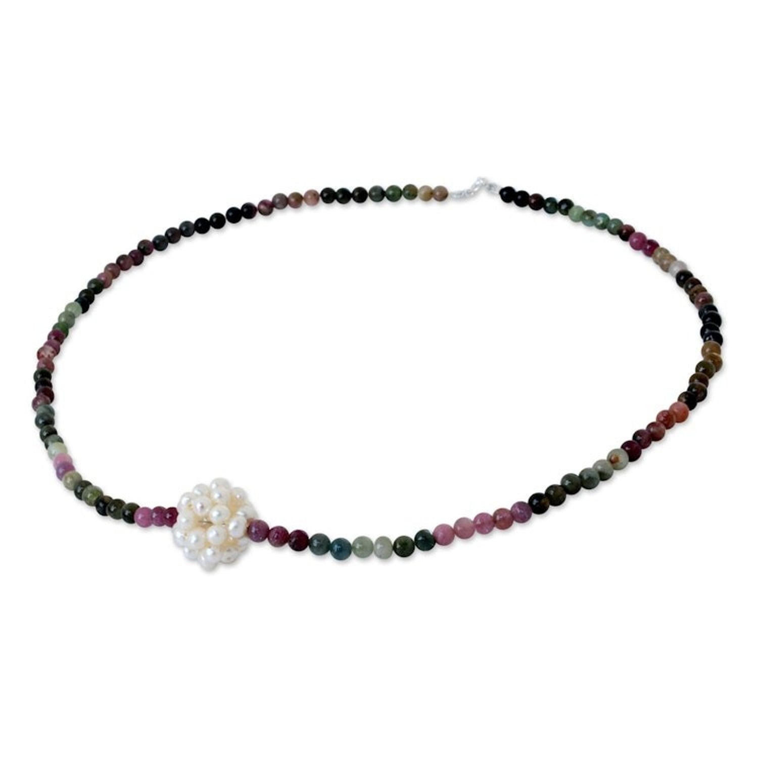This Beaded Tourmaline and Pearl Necklace 'Ivory Chrysanthemum' by Matta Nandrakwang is a beautiful necklace. Clustered together, cultured pearls form an ivory chrysanthemum. The artisan displays the lustrous gems on a necklace of tourmaline beads, showcasing the gem's wide range of colors. The piece is a beautiful blend of artistry and tradition.