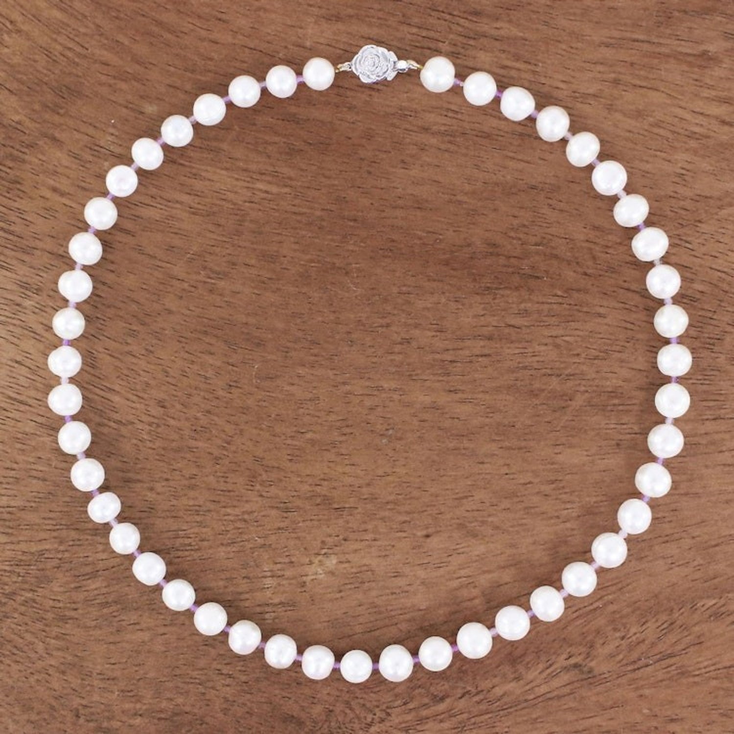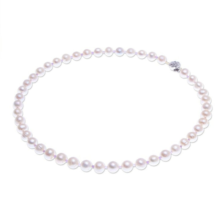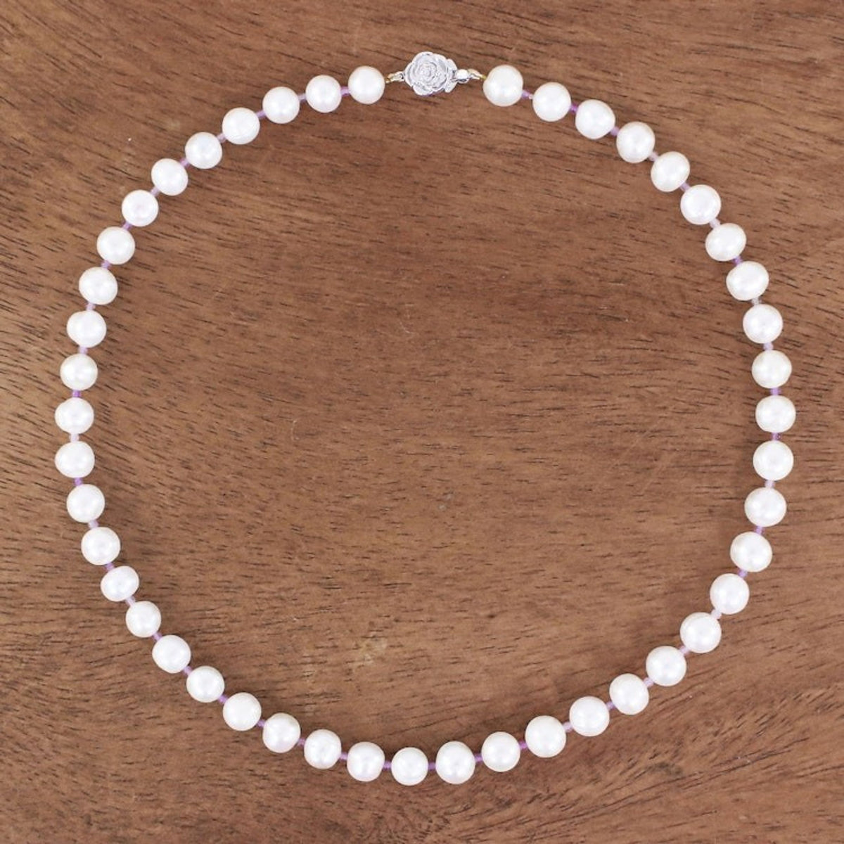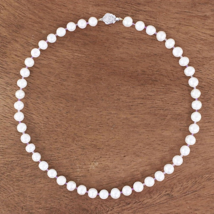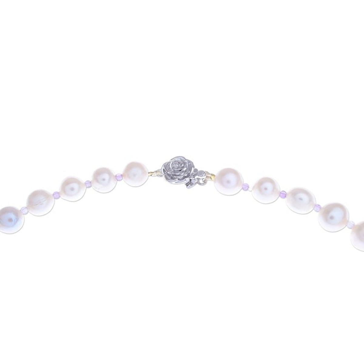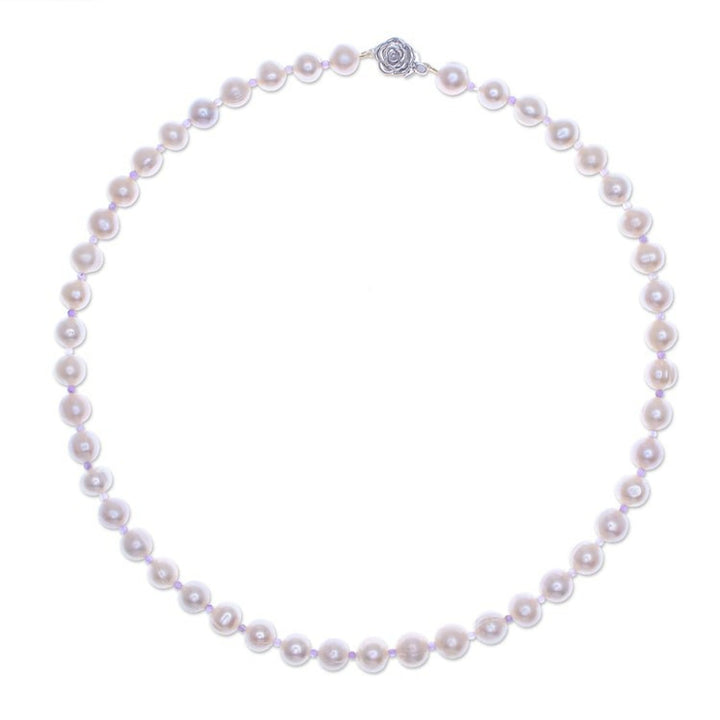 This Cultured Freshwater Pearl and Amethyst Beaded Necklace 'Sea Catch in Purple' by Matta Nandrakwang is a beautiful and elegant strand of naturally white pearls. The artisan alternates cultured freshwater pearls alongside petite amethyst gemstones to create the necklace, while a rose-shaped sterling silver box clasp adds an extra touch of loveliness.