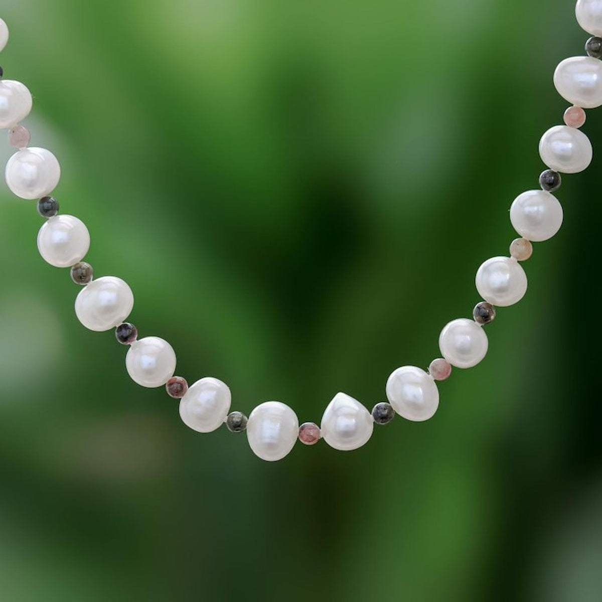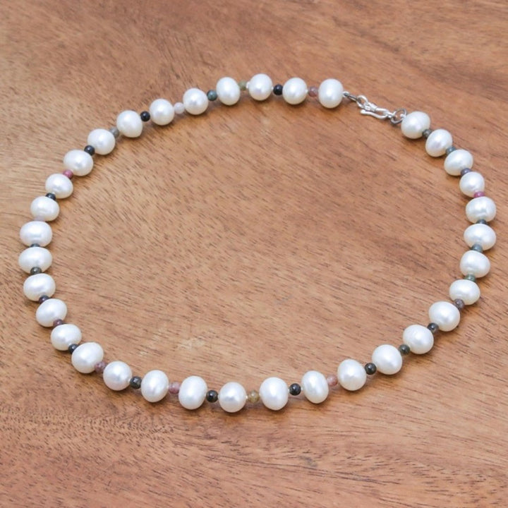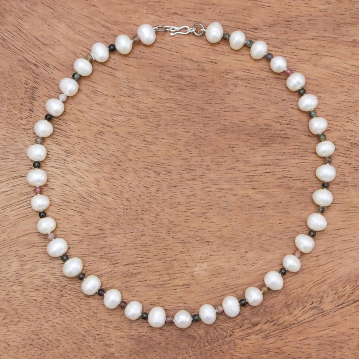 This Cultured Pearl and Tourmaline Beaded Necklace from Thailand 'Colorful Palace' by Matta Nandrakwang is a beautiful necklace fit for royalty. Glowing white, large cultured pearls alternate with smaller tourmaline stones to surround the neck. The necklace closes with a 950 silver clasp crafted by Karen hill tribe artisans.