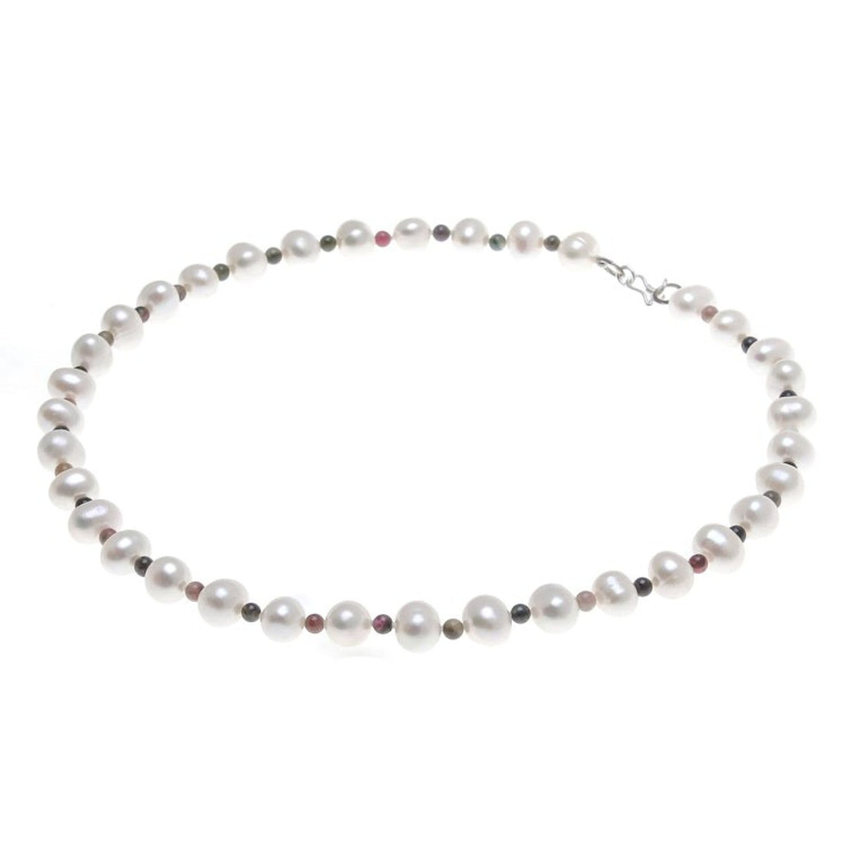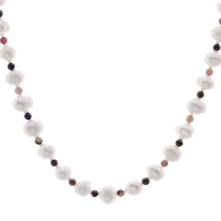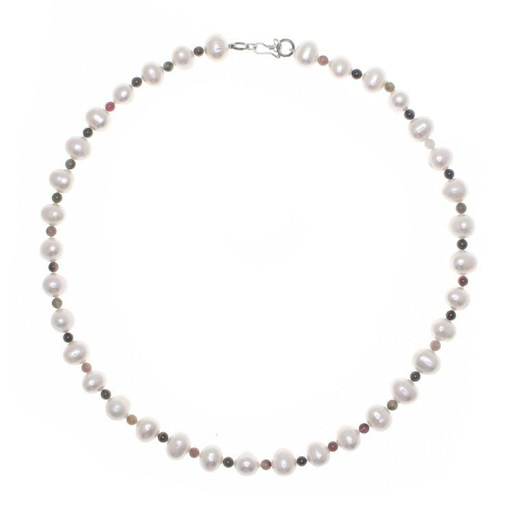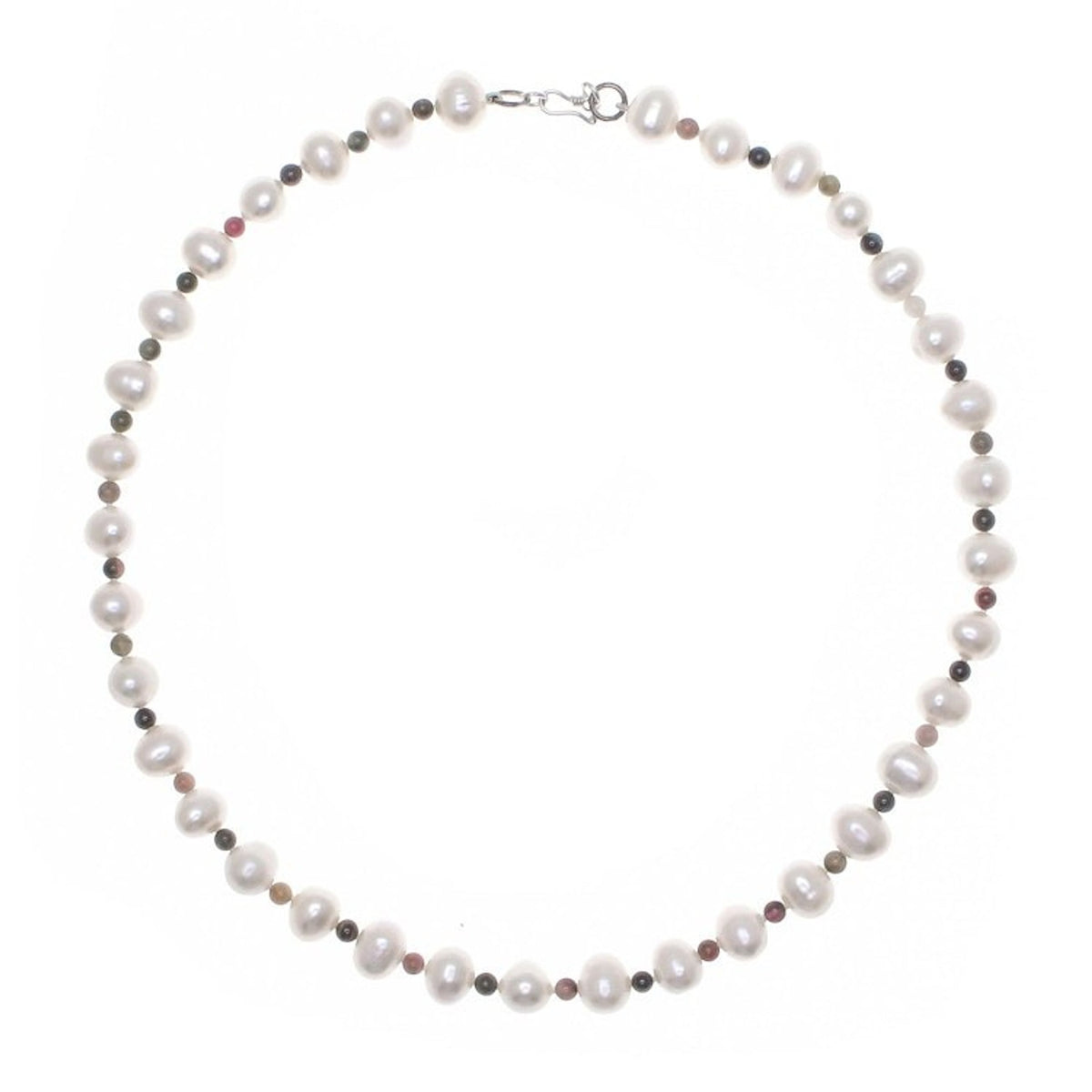 Handcrafted from cultured freshwater pearl, tourmaline, and a 950 silver clasp with a high polish finish, this necklace measures 19 inches in length and closes with an S-hook or hook clasp.