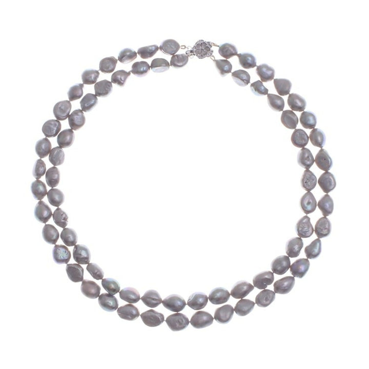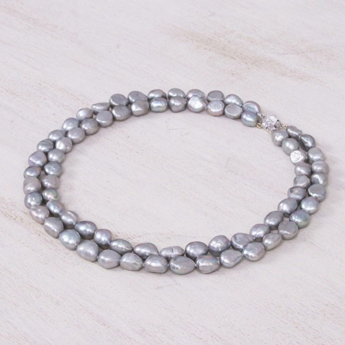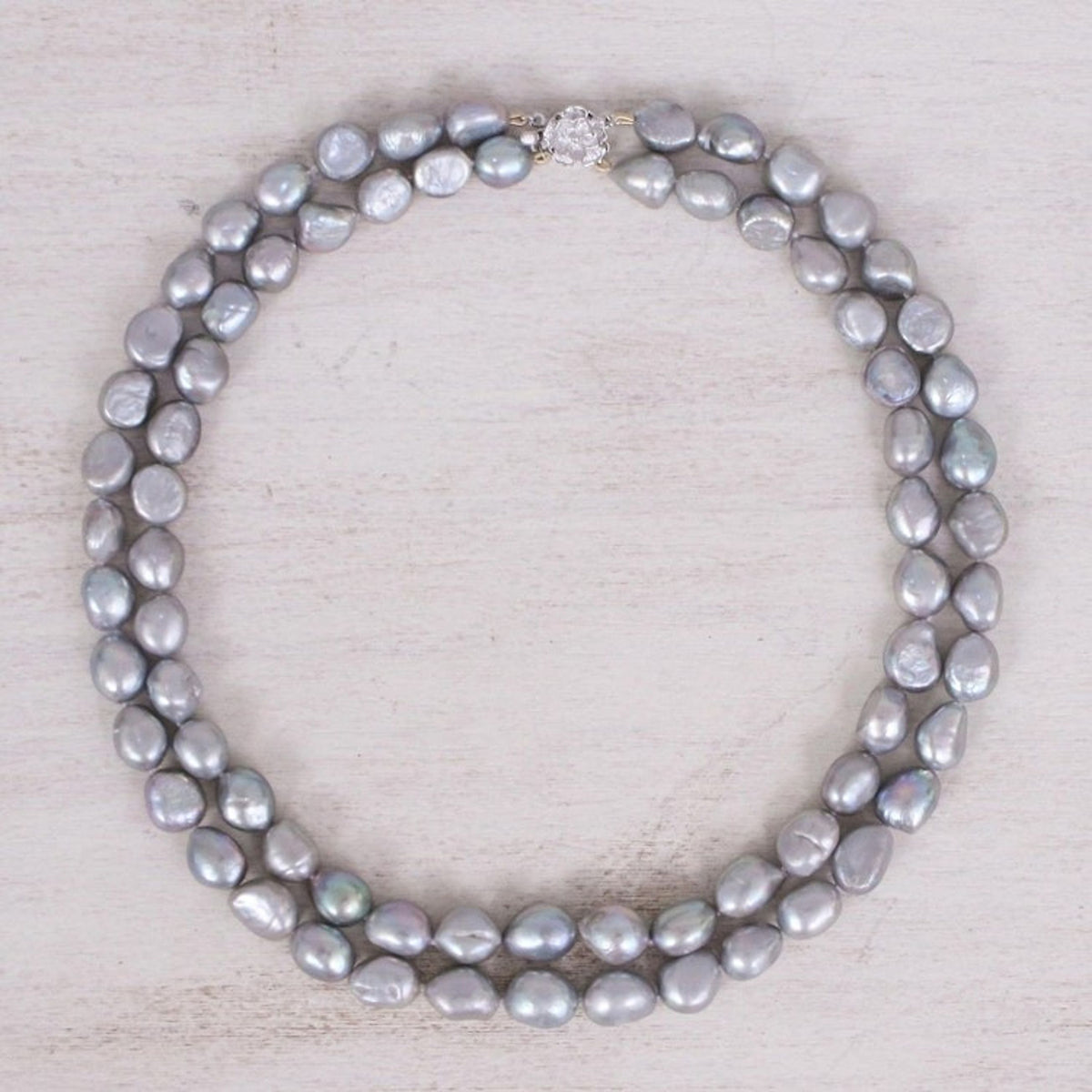 This Grey Cultured Pearl and Sterling Silver Necklace 'Grey Mermaid' by Matta Nandrakwang is an elegant, double-strand pearl necklace. The artisan hand-threads two strands of naturally grey cultured freshwater pearls, finishing the piece with a lovely flower-stamped box clasp. The piece is a wonderful blend of artistry and tradition.