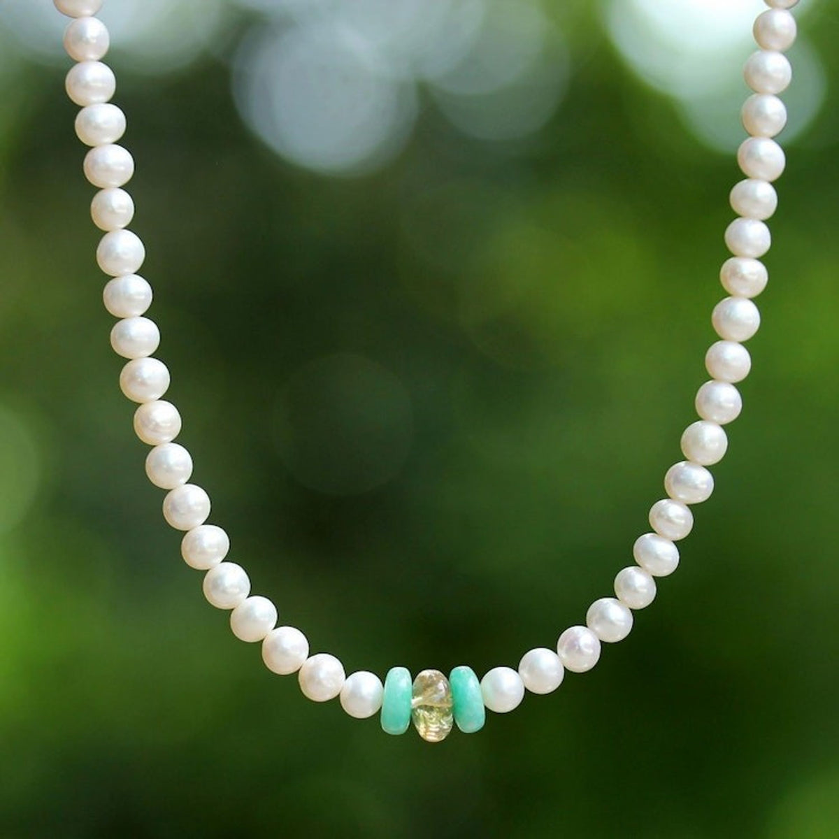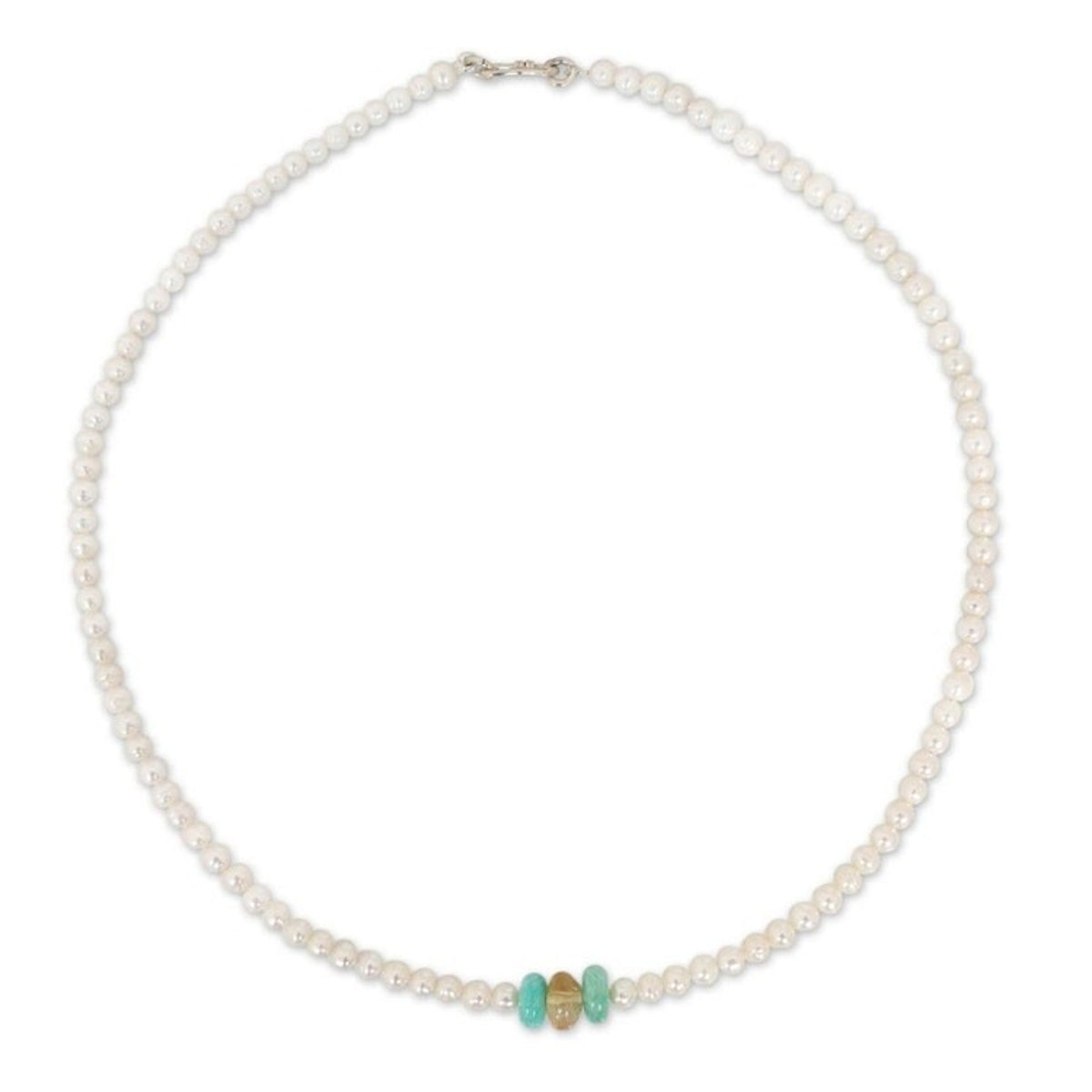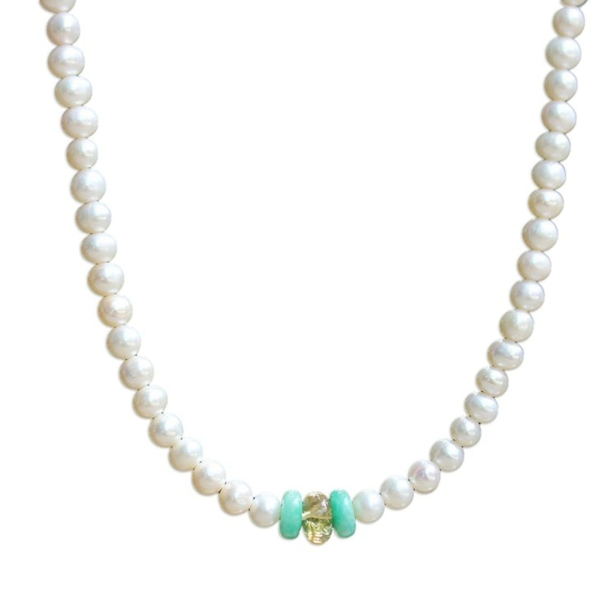 Handcrafted from cultured freshwater pearl, amazonite, and citrine with a sterling silver clasp, this necklace measures 16.5 inches in length and closes with a lobster claw clasp.