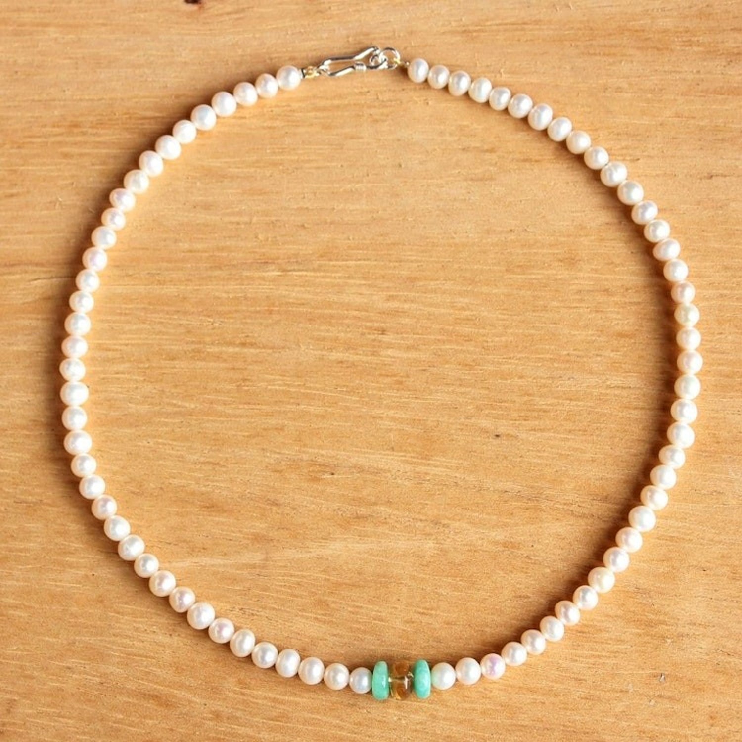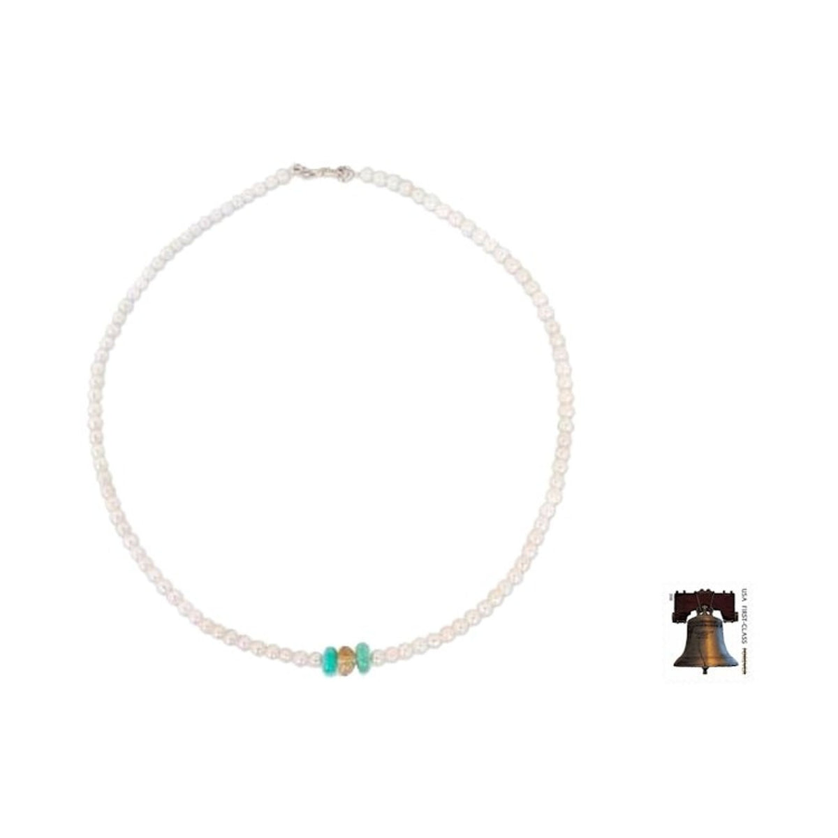This Pearl and Amazonite Necklace 'Lovely Lady' by Matta Nandrakwang is a feminine, modern and lovely necklace. Radiant gemstones, amazonite and citrine, bring beautiful color to a single strand of white cultured pearls. The piece is a wonderful example of the artisan's love of gems and the art of jewelry.
