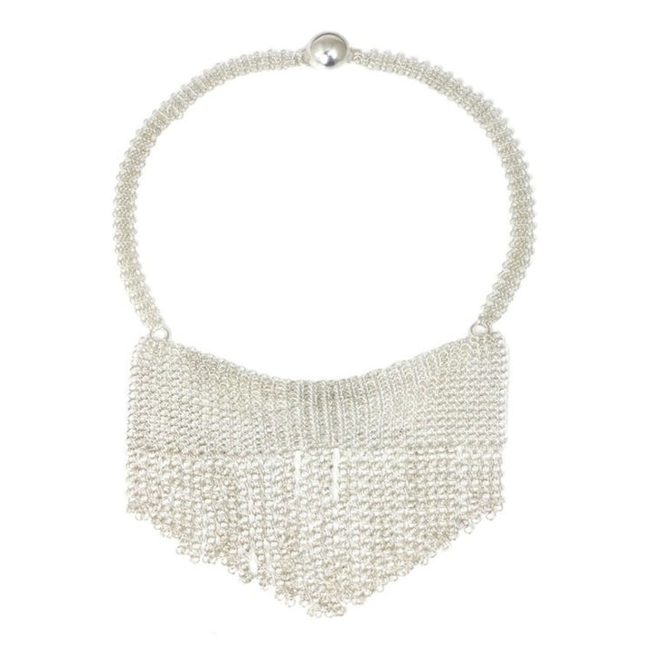 This Sterling Silver Cascade Statement Necklace by Piraporn Anupongpipat is a spectacular piece that makes an unmistakable statement of elegance and style. Piraporn, a descendant of the Mien tribe, blends traditional silver artistry with her own innovative design to create a stunning cascade of shimmering sterling silver chains. The graceful design drapes beautifully, evoking the image of a "Moonlight Waterfall" that glows and moves with the wearer. This necklace is a masterpiece of fluid and sculptural design, perfect for adding a touch of dramatic sophistication to any ensemble.