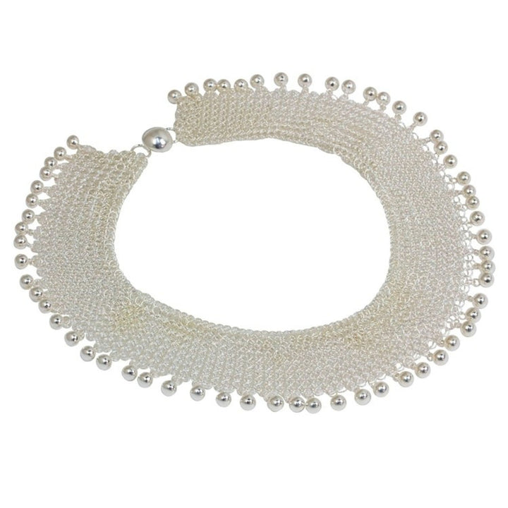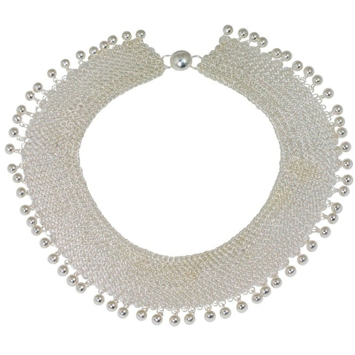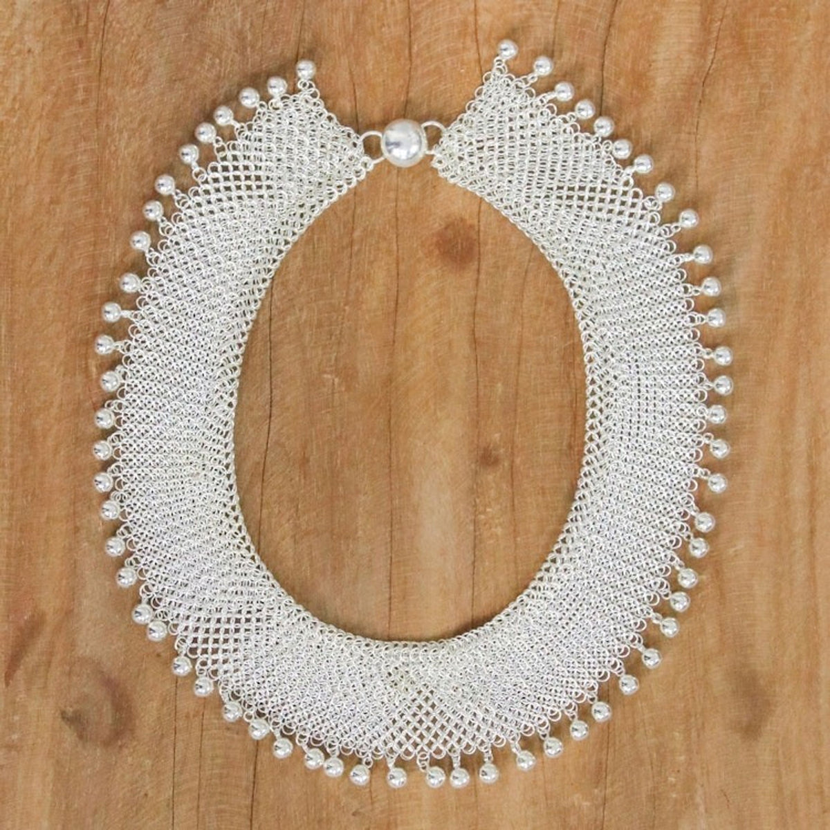 This Thailand High Polish Sterling Silver Layered Collar Necklace by Piraporn Anupongpipat radiates splendor with its intricate and bold design. Inspired by her family's tradition of silver artistry, Piraporn creates this spectacular collar necklace by hand, weaving together fine chains to create a unique chain-link design with spherical accents. The high-polish finish gives the piece a stunning luster that catches the light beautifully. This necklace is an unmistakable statement piece that drapes like fabric, offering a luxurious and elegant touch to any outfit.
