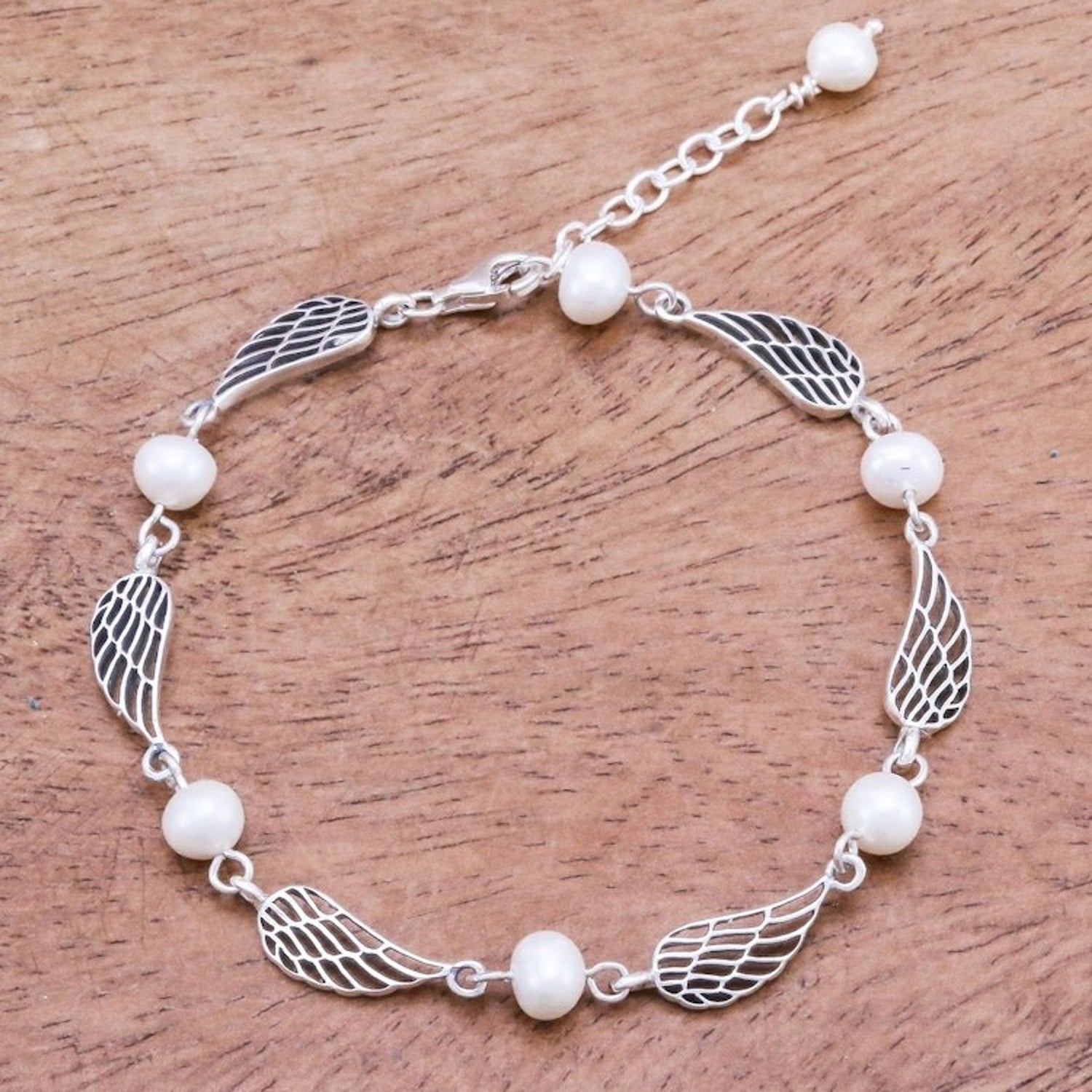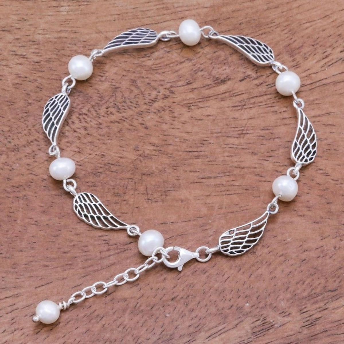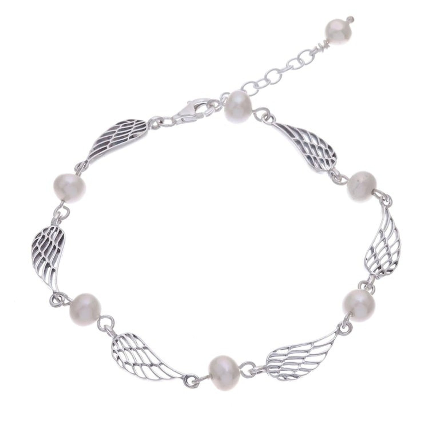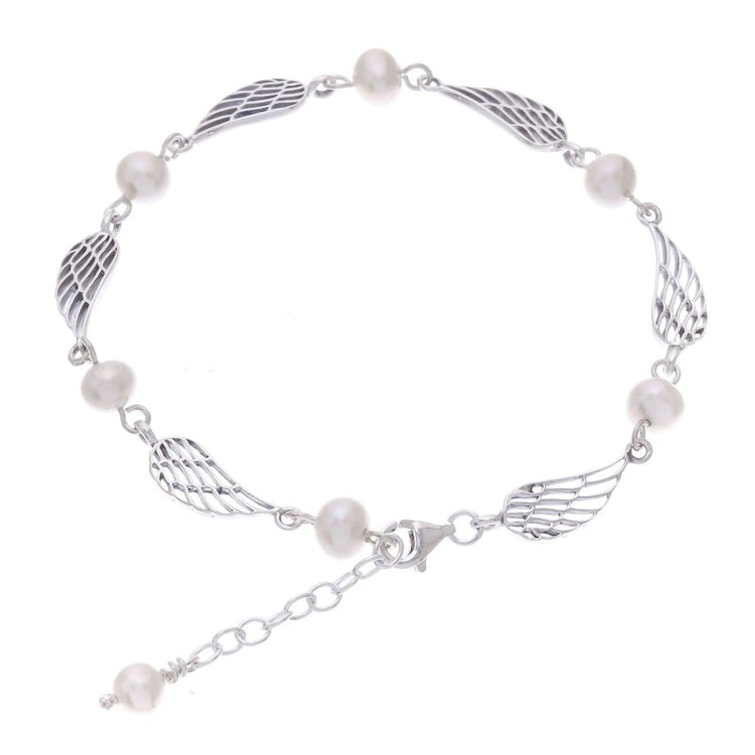 Thai Handcrafted Cultured Pearl Bracelet with Silver Wings 'Flying Free'
