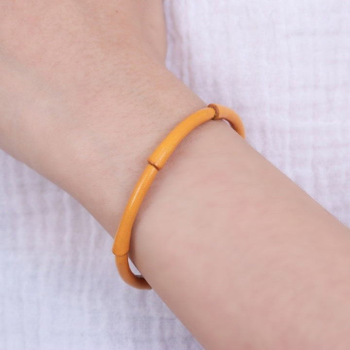 This Bamboo-Inspired Adjustable Yellow Leather Cuff Bracelet by Prasit Tangmahastitkul, also known as Chang, is a stylish and joyous accessory for those who love the natural world. Inspired by the beauty of Thailand's bamboo forests, Chang meticulously crafts this cuff bracelet from bright yellow leather, a color that symbolizes joy. The bracelet features an aluminum structure that allows you to easily adjust it for a perfect, comfortable fit. This piece is perfect for adding a touch of sunshine and an adventurous aura to your days and nights.