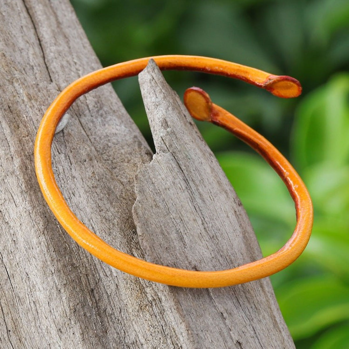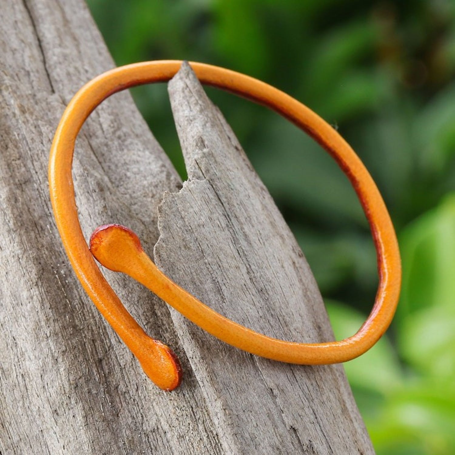 This Thai Handmade Unisex Dyed Leather Cuff Bracelet in Orange by Prasit Tangmahastitkul, known as Chang, is a stylish and versatile accessory for all. The cuff is handmade from vibrant orange-dyed leather, a color that makes any look come alive. It has round ends inspired by flower buds and an aluminum wire base that allows it to be adjusted to a perfect fit for both men and women. This simple yet unique design is perfect for adding a pop of confident color and a touch of original style.