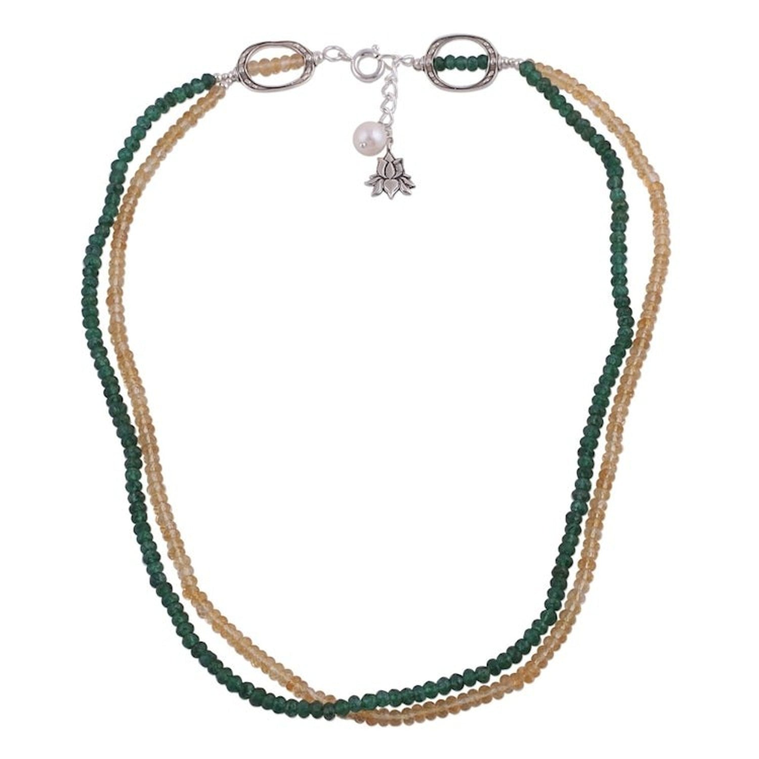 This Aventurine Citrine and Cultured Pearl Beaded Necklace by Rituu Agarwal is a stunning and elegant beaded necklace. The strands are made from earthy green aventurine and sunny yellow citrine beads, creating a beautiful and harmonious color combination. The clasp is flanked by sterling silver oval links and features a dangling sterling silver lotus charm and a luminous cultured freshwater pearl. This necklace is a unique blend of natural gemstones and refined metalwork, perfect for adding a touch of mystique to your look.