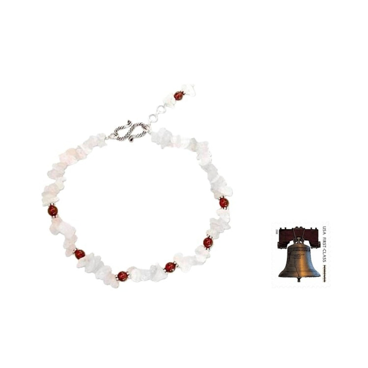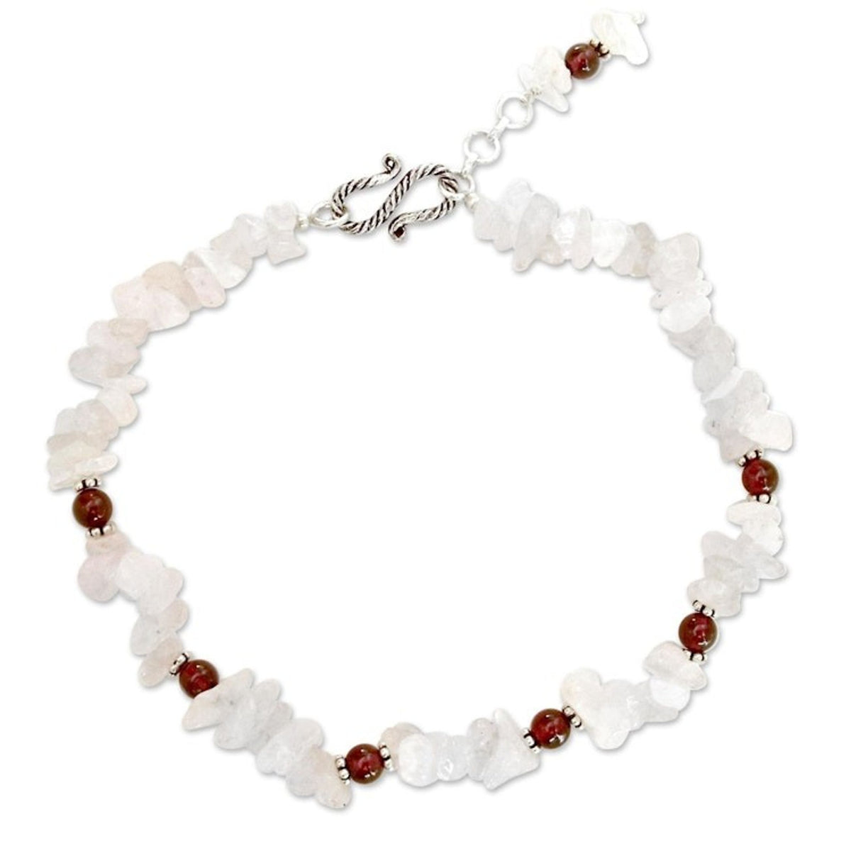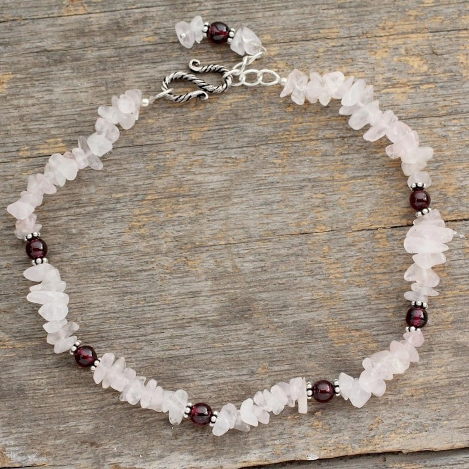 Handcrafted from sterling silver, rose quartz, and garnet, this bracelet measures 10 to 10.5 inches L and 0.4 inches W. The pendant measures 0.6 inches L x 0.4 inches W and fastens with an S-hook or hook clasp. Variations in color and/or pattern are to be expected.