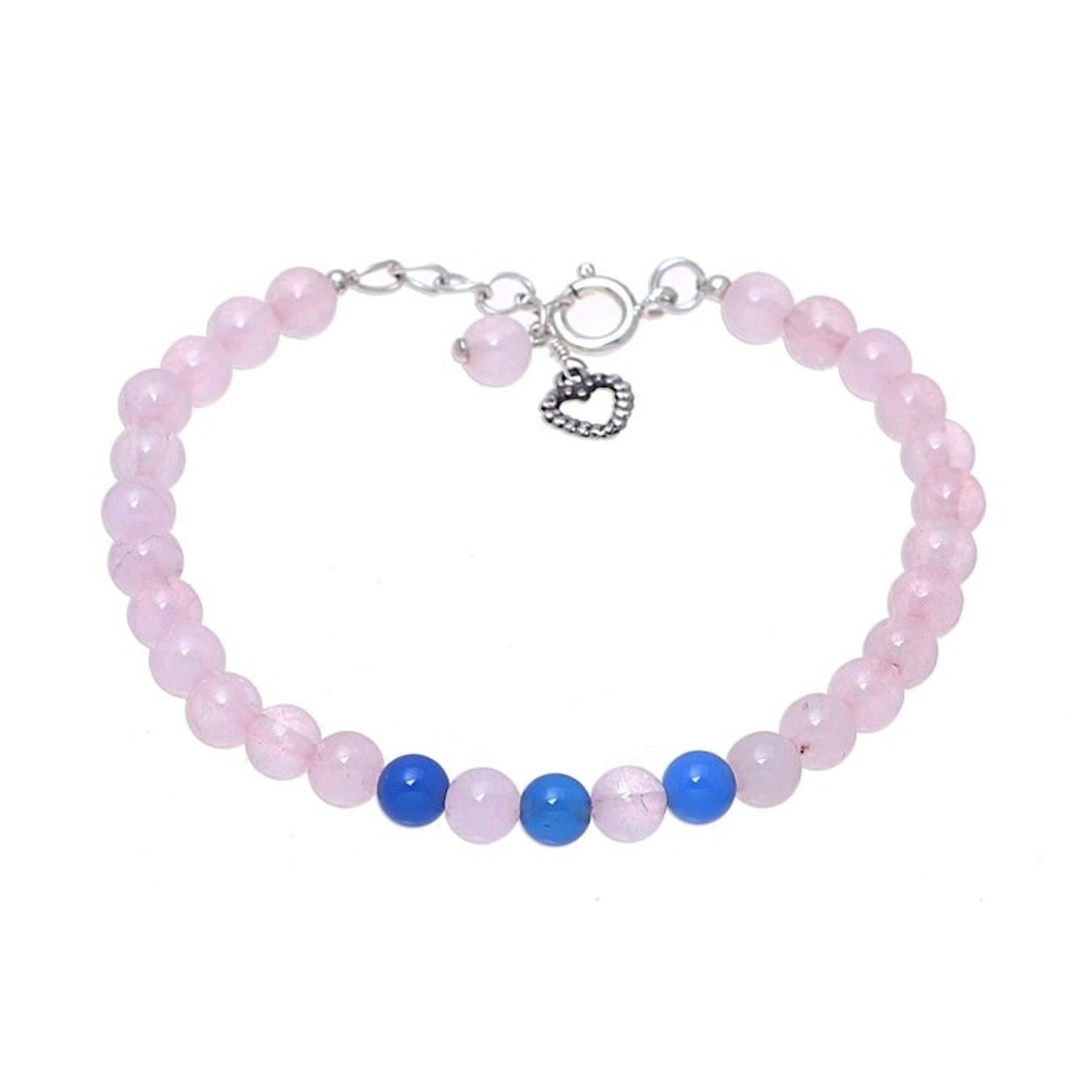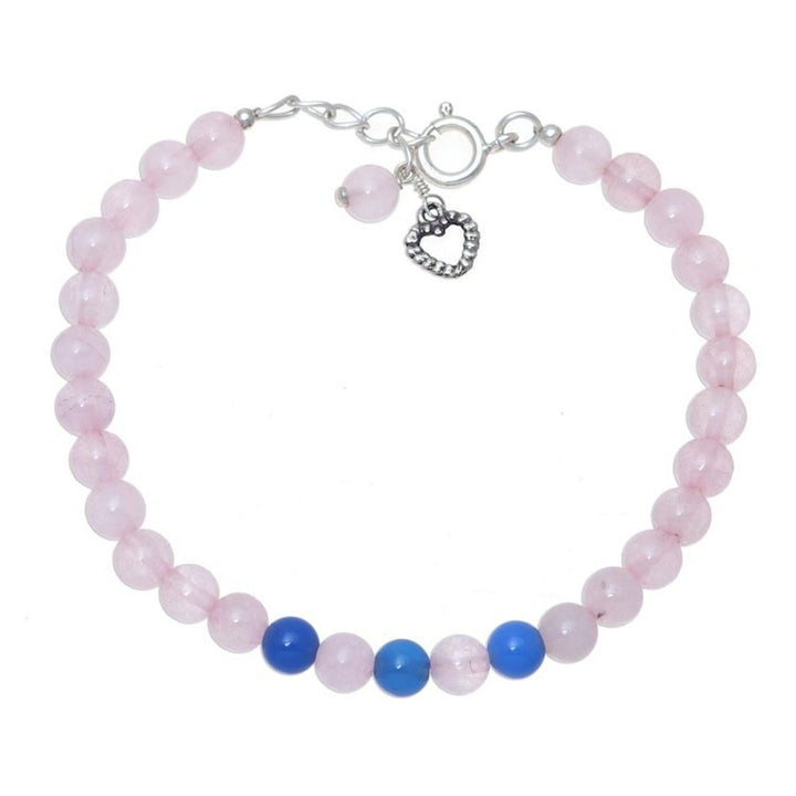 This Rose Quartz and Chalcedony Beaded Bracelet by Rituu Agarwal is a lovely accessory that tells a story of "Pretty Love." It features soft rose quartz beads circling the wrist, with alternating blue chalcedony gems at the center. The bracelet closes with a sterling silver clasp from which a rose quartz bead and a heart-shaped sterling charm dangle. It is a charming and heartfelt accessory that celebrates love and beauty.