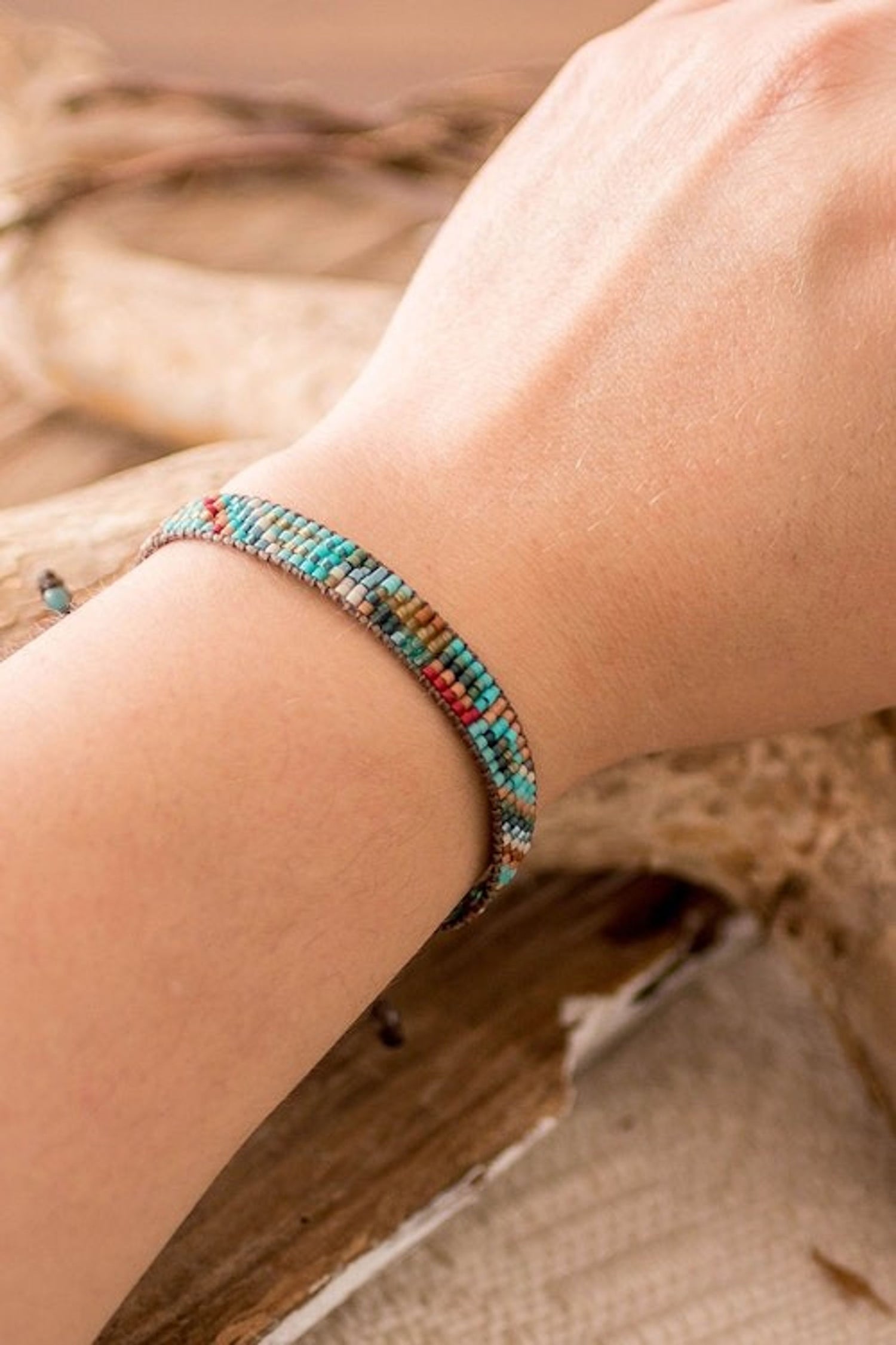 This Colorful Beaded Wristband Bracelet by Rosa Hern is a vibrant and eye-catching accessory. Hand-woven using intricate bead loom techniques, it features lively glass beads in a wristband style. The bracelet adds a spark of color to any look and is as practical as it is beautiful with its adjustable sliding knot closure.