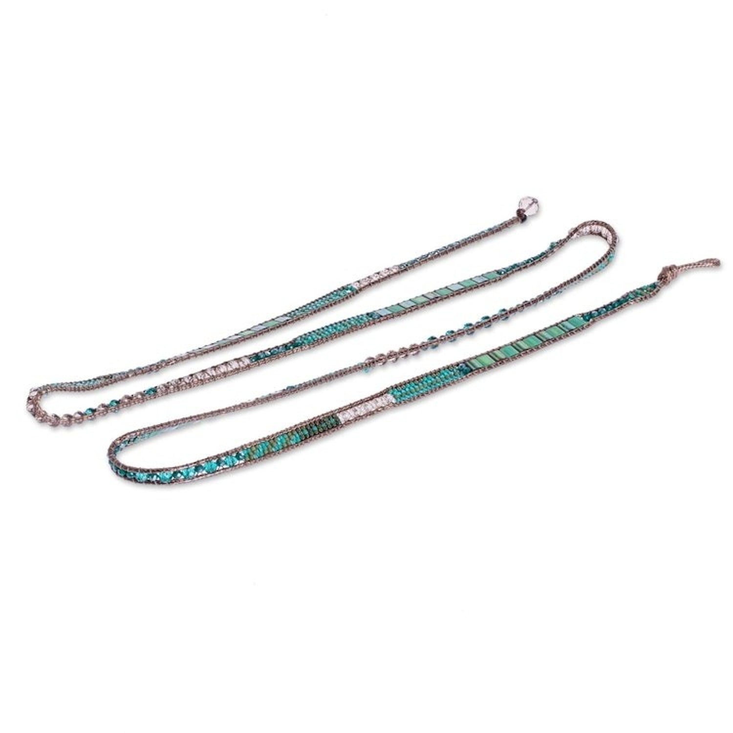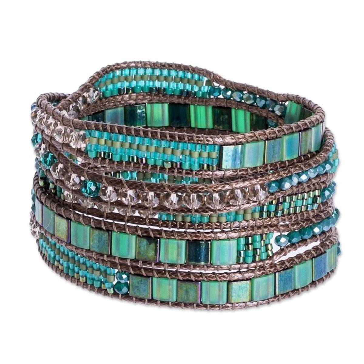 Handcrafted from glass and crystal beads with a nylon cord, this wrap bracelet has a total length of 35 inches and a wrist size of 7.5 inches. It has a button clasp. Variations in color, size, and motif are to be expected.