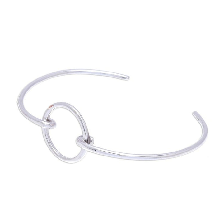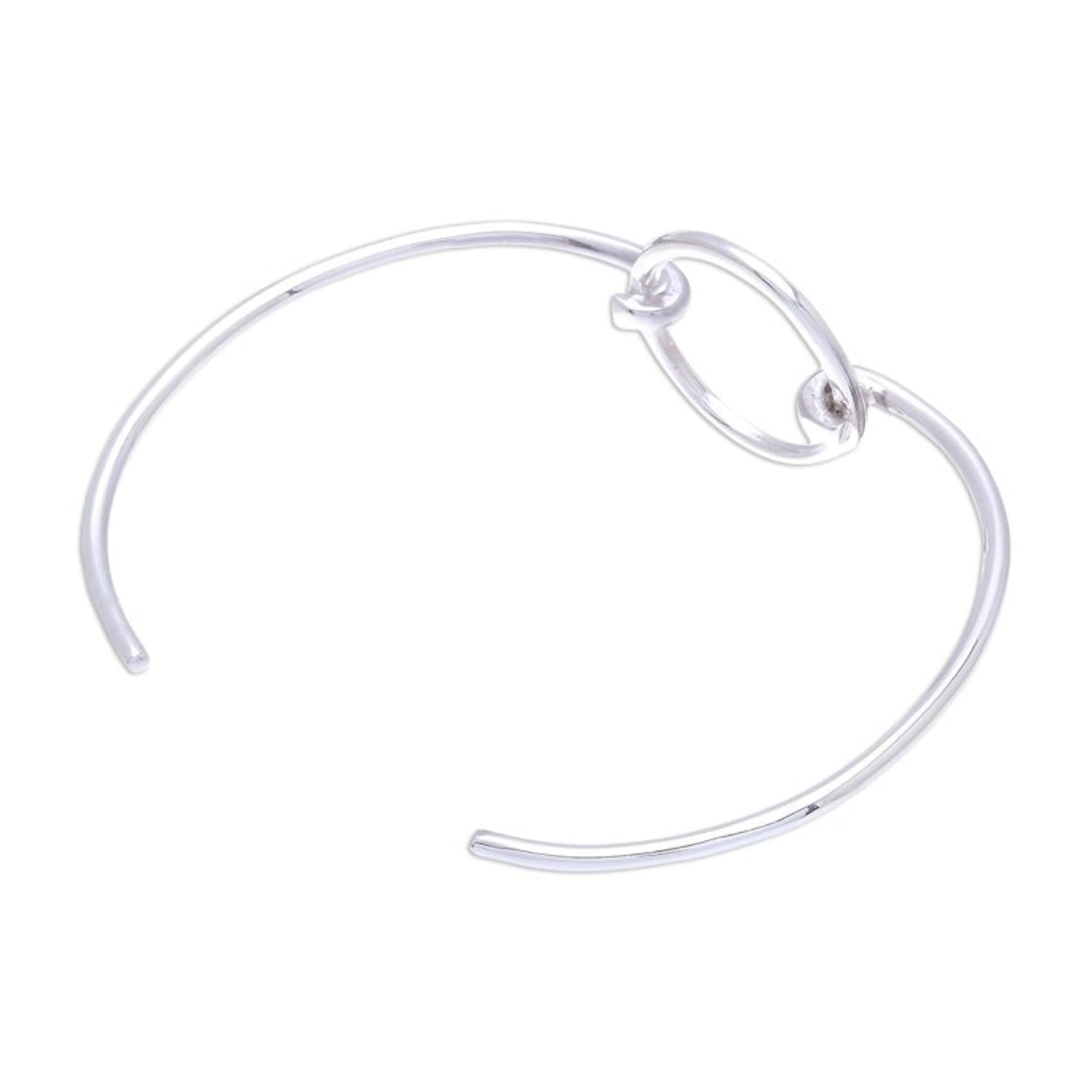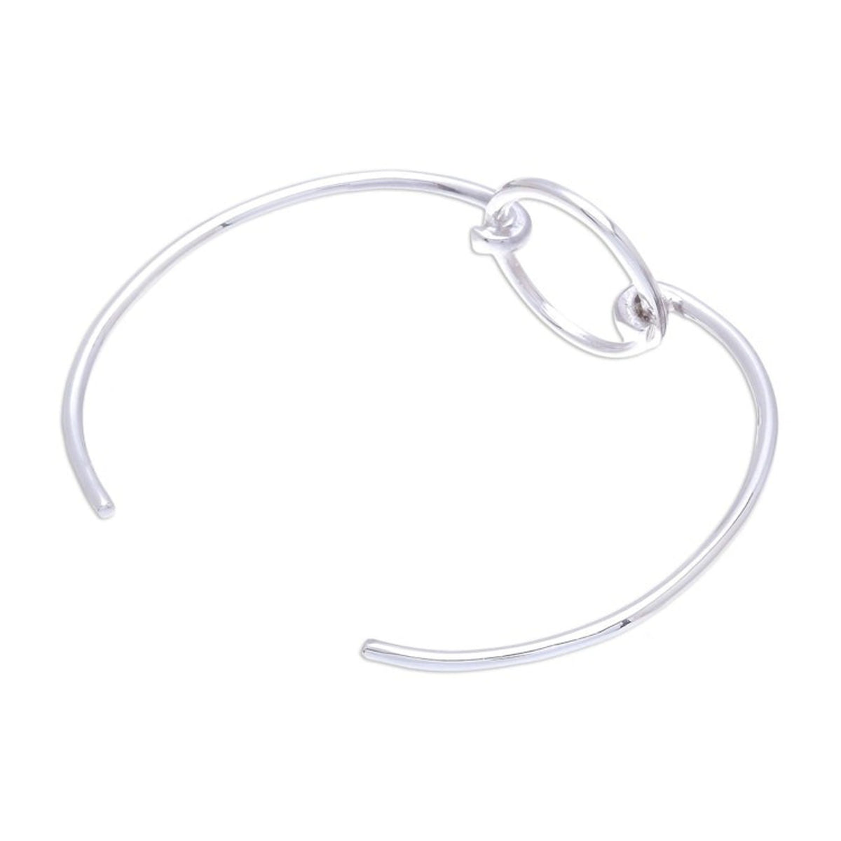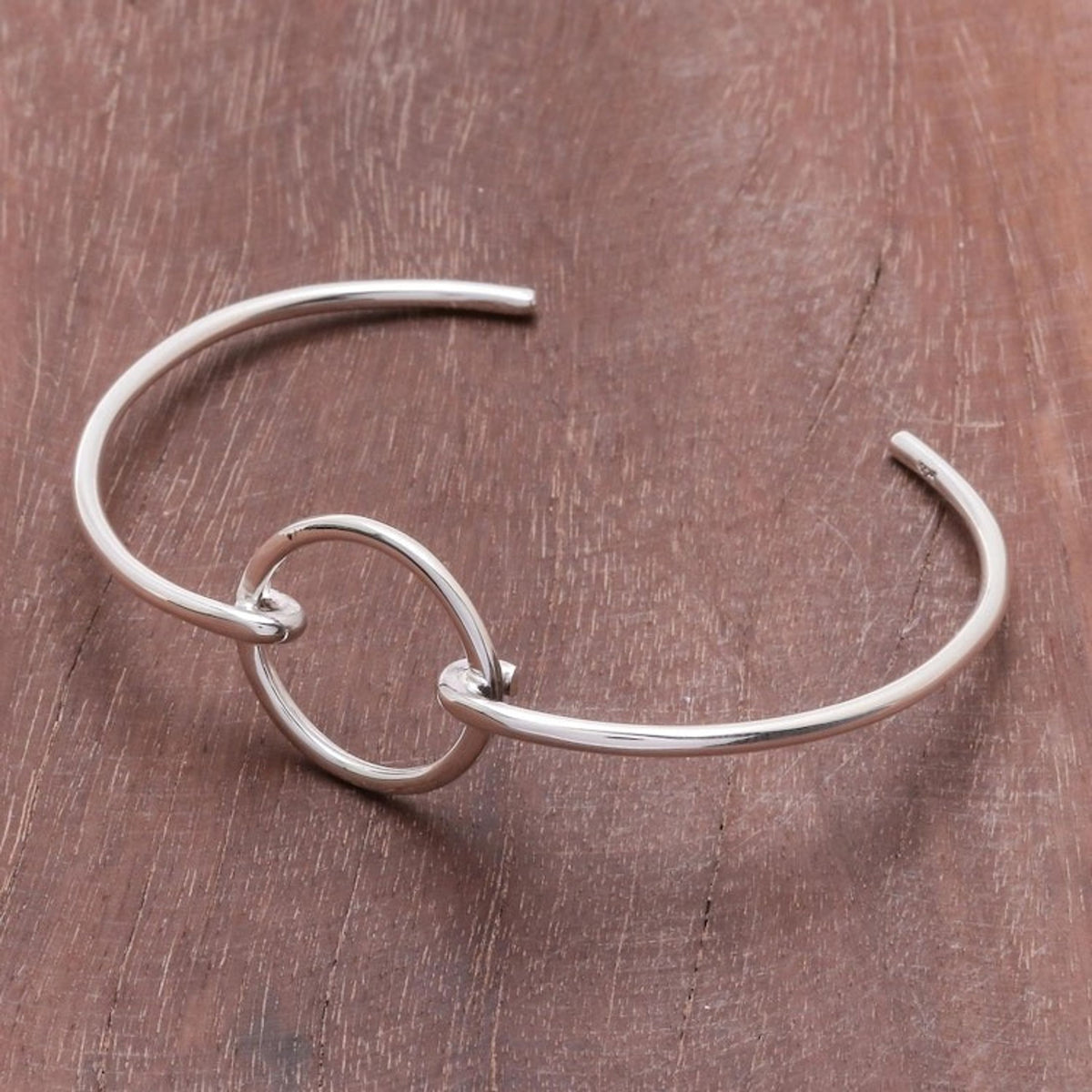 This Modern Sterling Silver Cuff Bracelet with a Circular Pendant by Rudklow Patanaanunwong is a contemporary and minimalist accessory. The cuff bracelet is crafted from sterling silver with a gleaming high-polish finish. At the center, a circular pendant with an open space creates a sleek and modern design that is perfect for a minimalist look.