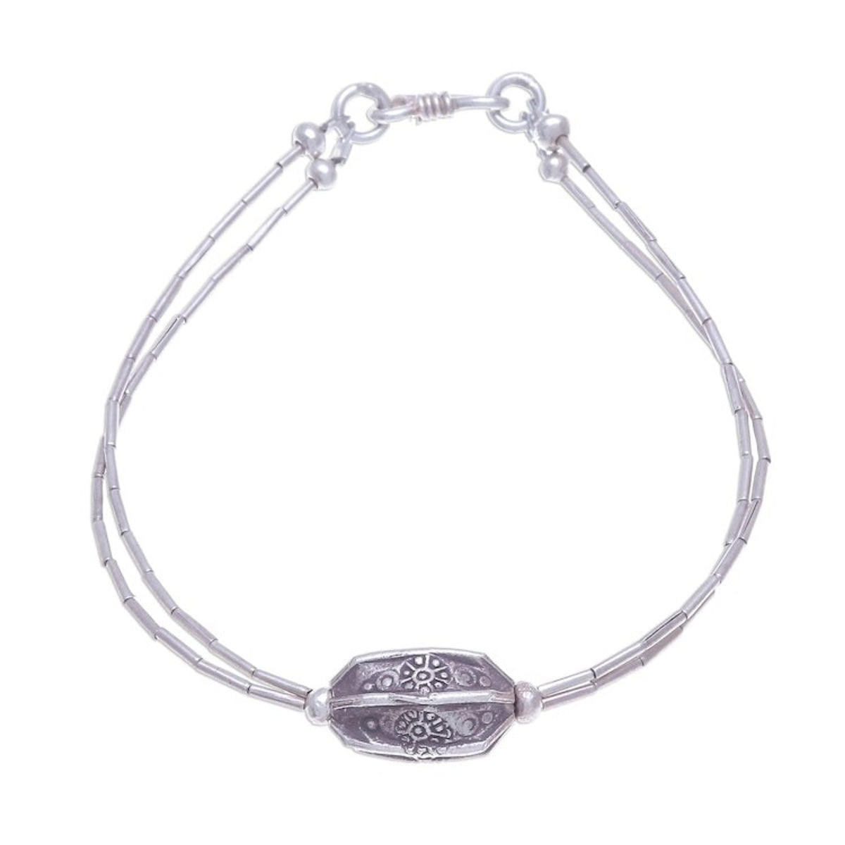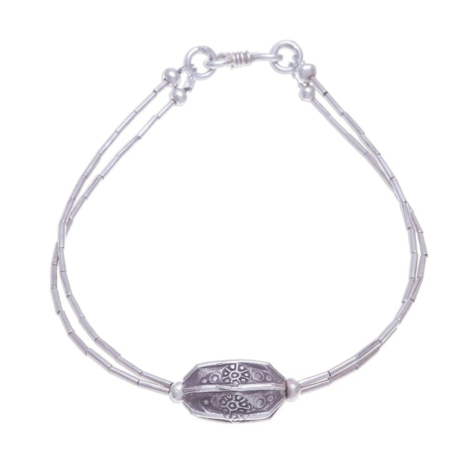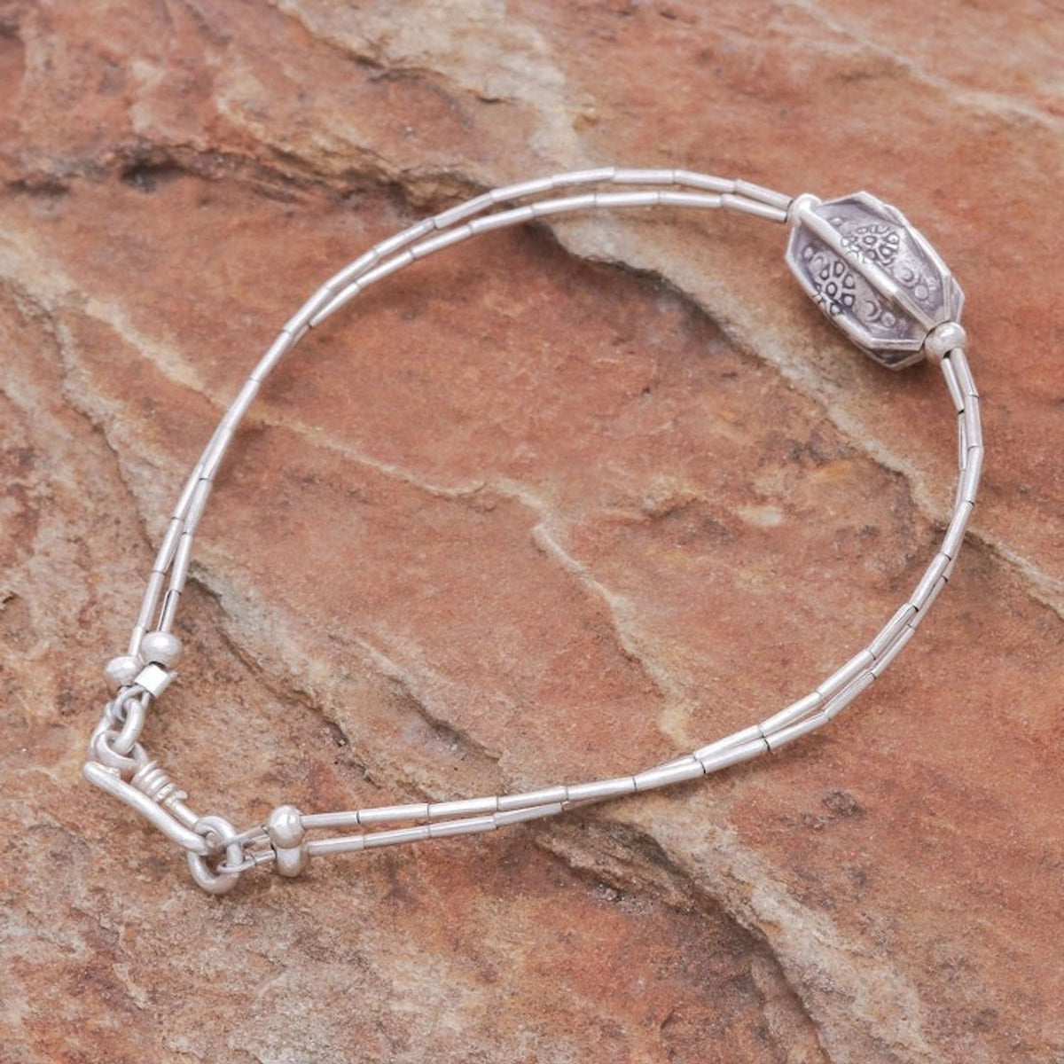 This Karen Hill Tribe Beaded 950 Silver Pendant Bracelet by Sasithon Saisuk is a beautiful and original accessory. The bracelet features two strands of slender silver tubes that are centered by an oxidized pendant. The pleated barrel-shaped pendant has traditional hill tribe stamped motifs, making it a unique and culturally significant piece.