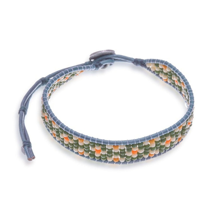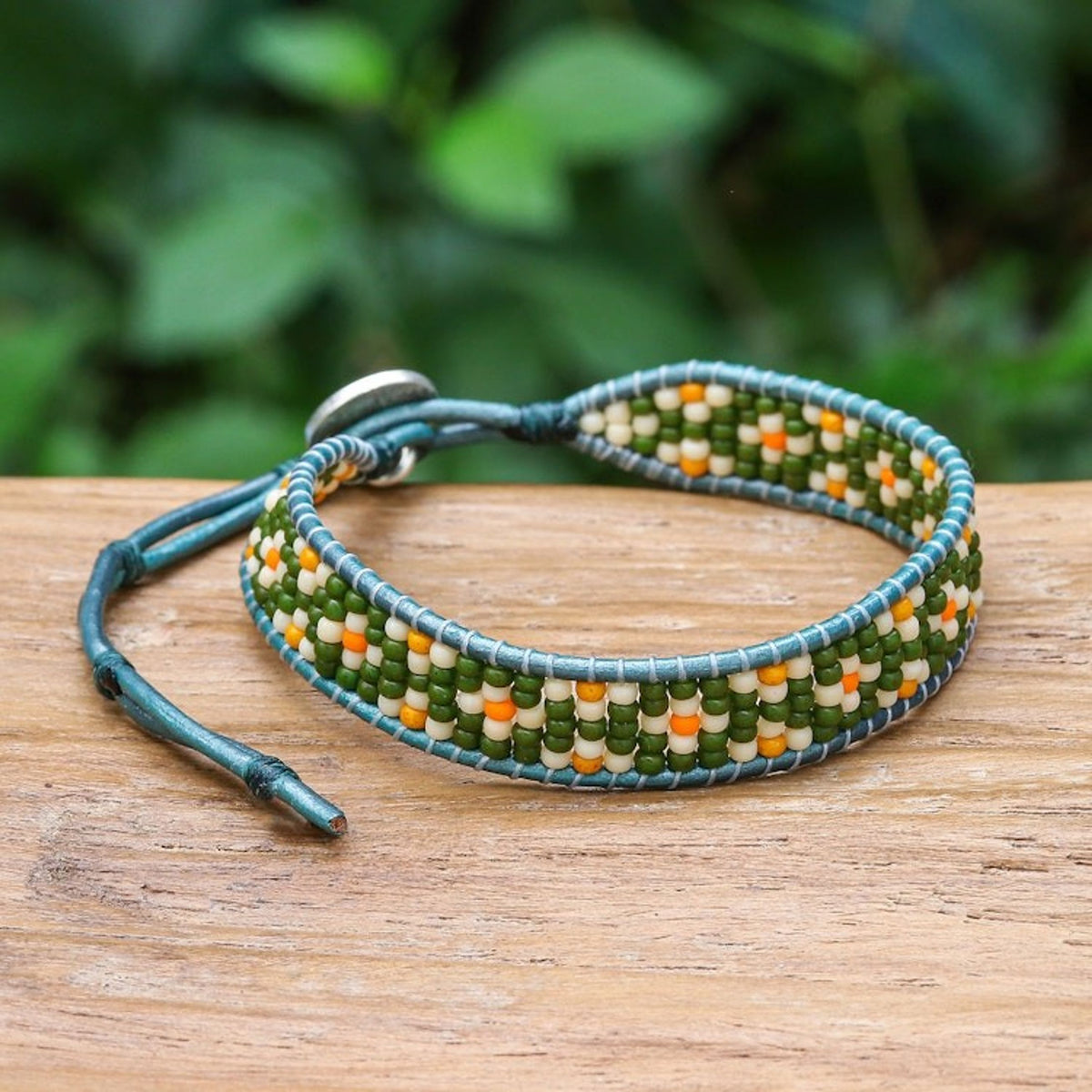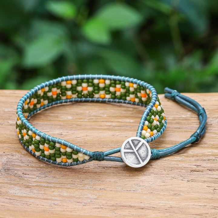 Adjustable Green and Ivory Glass Beaded Wristband Bracelet 'Peace at the Jungle'