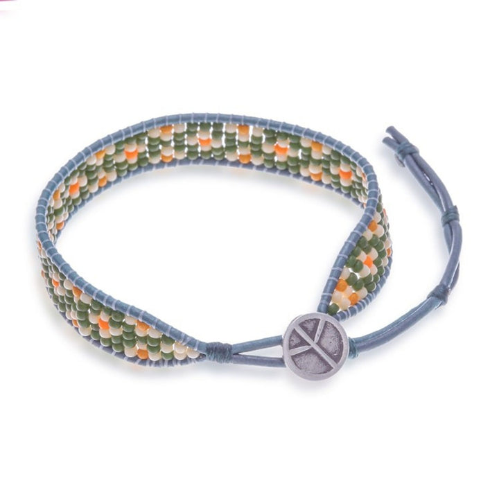 This Adjustable Green and Ivory Glass Beaded Wristband Bracelet by Siriporn Tongwat is a bohemian accessory. The wristband is crafted from glass beads in green, ivory, and yellow hues, reminiscent of a harmonious jungle. It also features refined leather cords and is crowned by a silver peace pendant and an adjustable button closure.