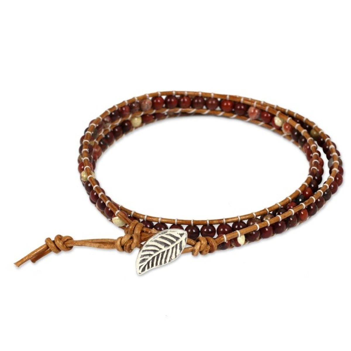 Handcrafted from enhanced jasper, leather, and 950 silver, this adjustable wrap bracelet measures 13.8 to 14.5 inches L and 0.2 inches W. It has a combination finish and a button clasp.