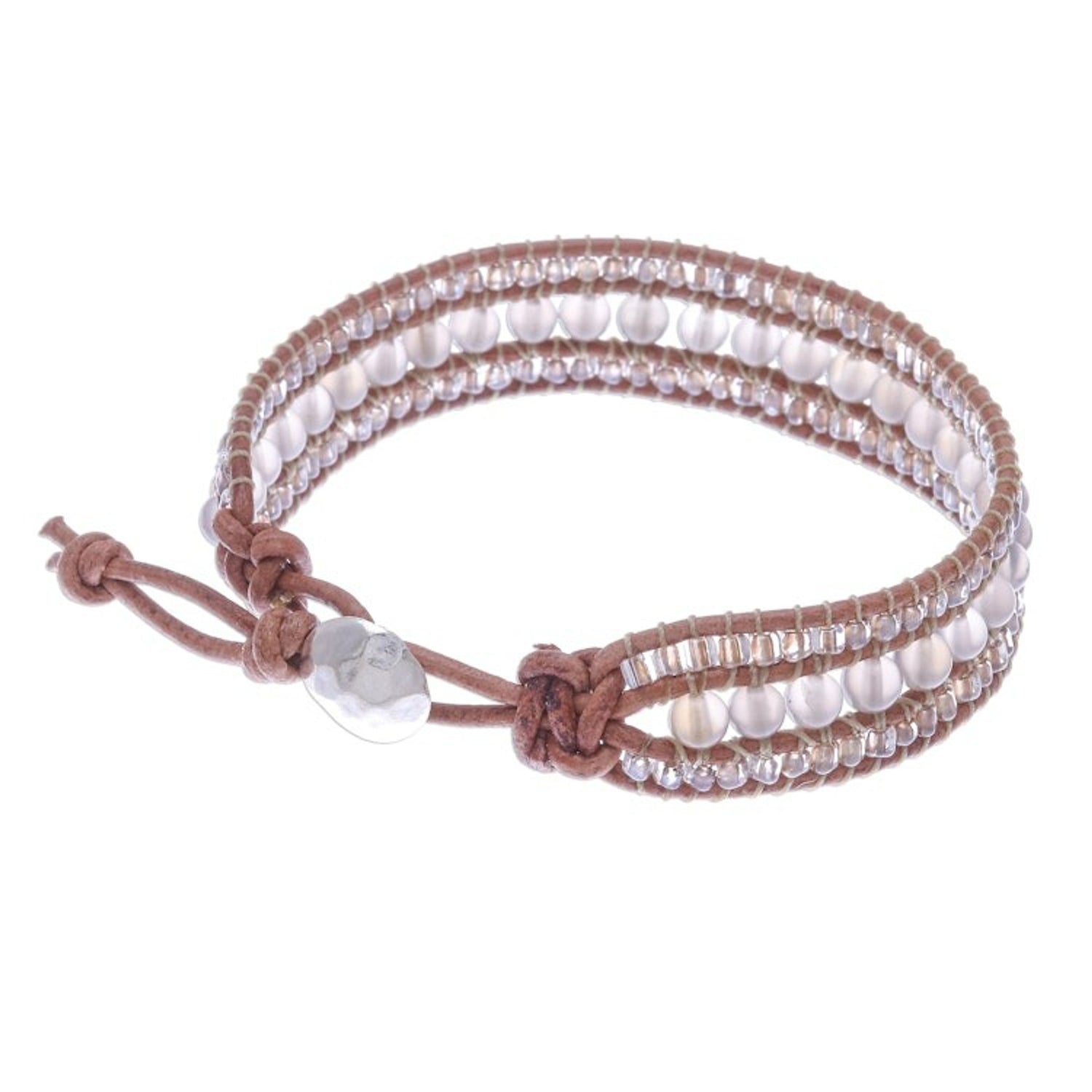 Handcrafted from chalcedony, glass beads, leather cord, and 950 silver, this adjustable bracelet measures 7 to 7.8 inches L and 0.6 inches W. It has a hammered finish and a button clasp.