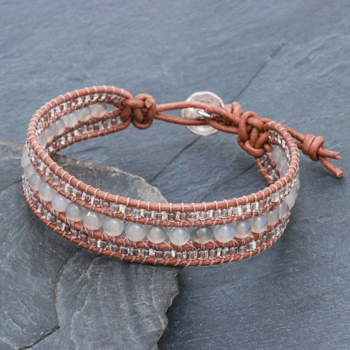 Chalcedony and Glass Bead Leather Bracelet 'Sidetracked'