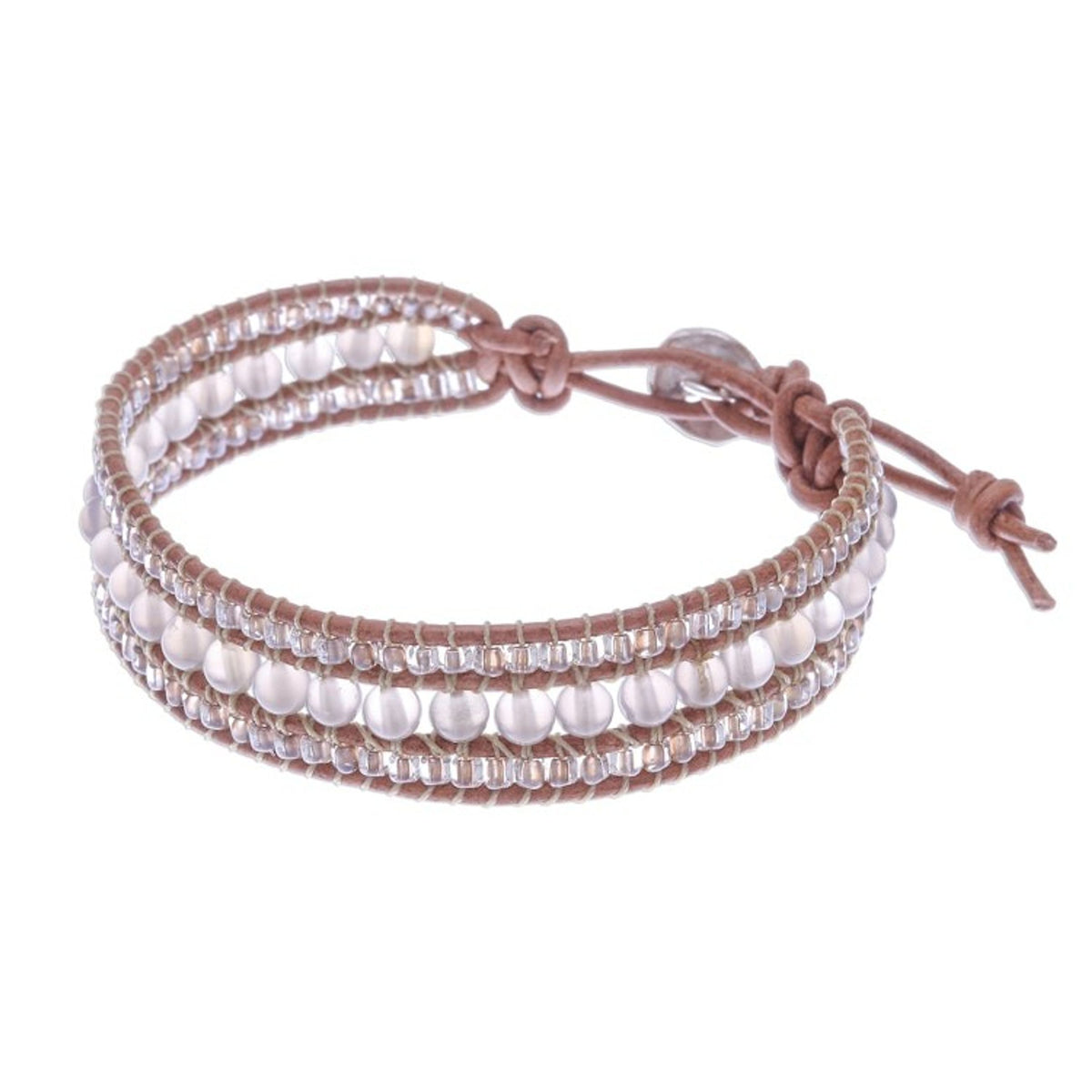 This Chalcedony and Glass Bead Leather Bracelet by Siriporn Tongwat is a pretty and bohemian-chic accessory. The bracelet features misty chalcedony and petite glass beads knotted on brown leather cords in three rows. It fastens at one of two lengths with a hammered 950 silver button.