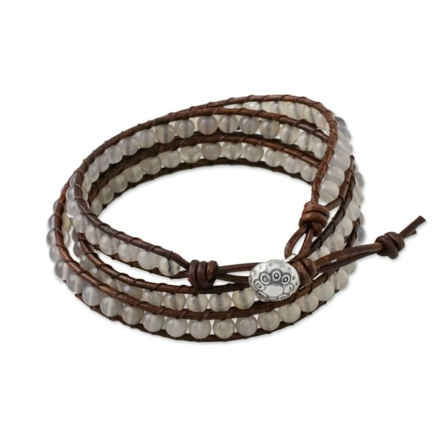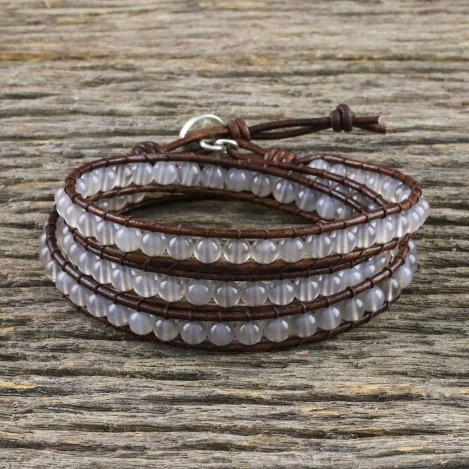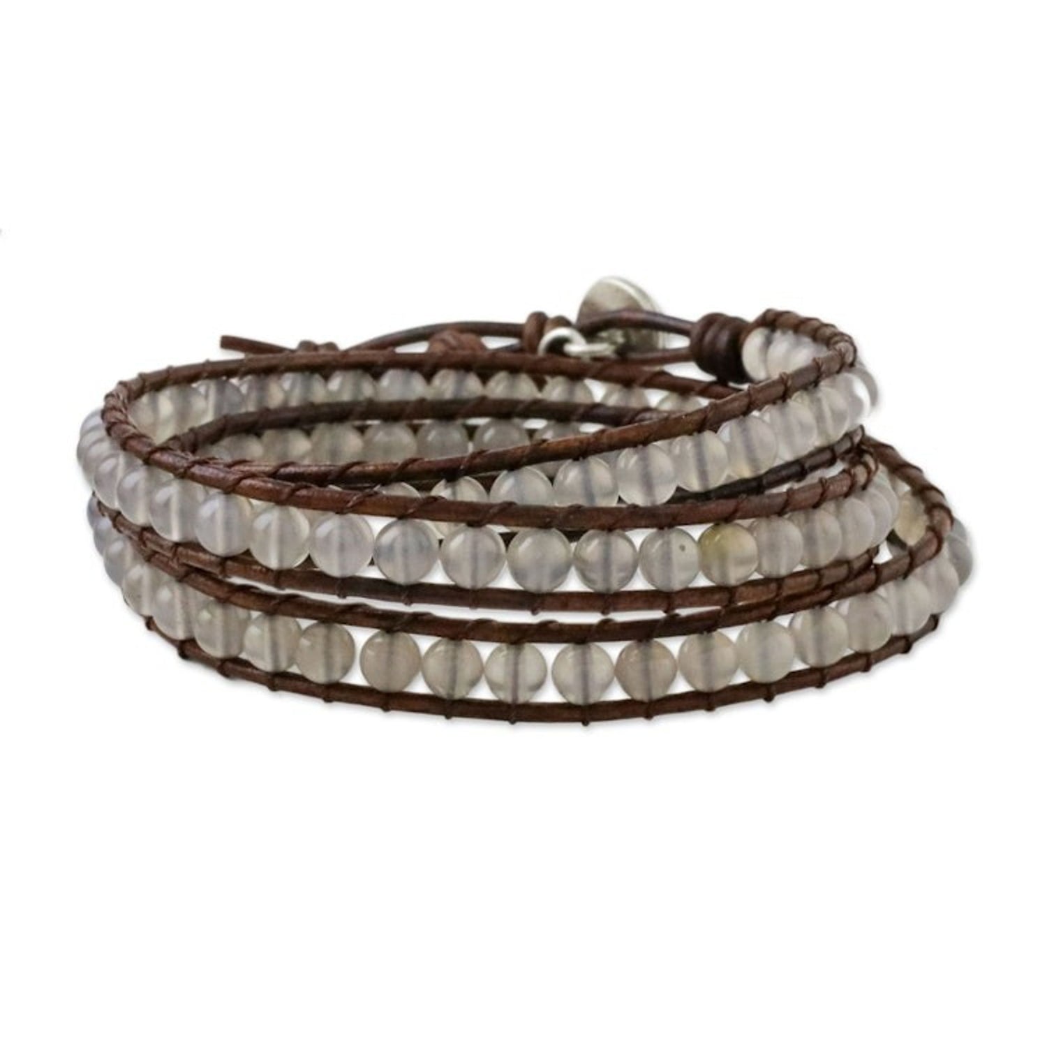 Chalcedony and Leather Beaded Wrap Bracelet from Thailand 'Spring Fog'