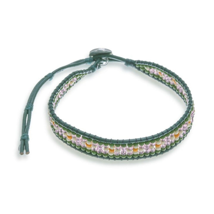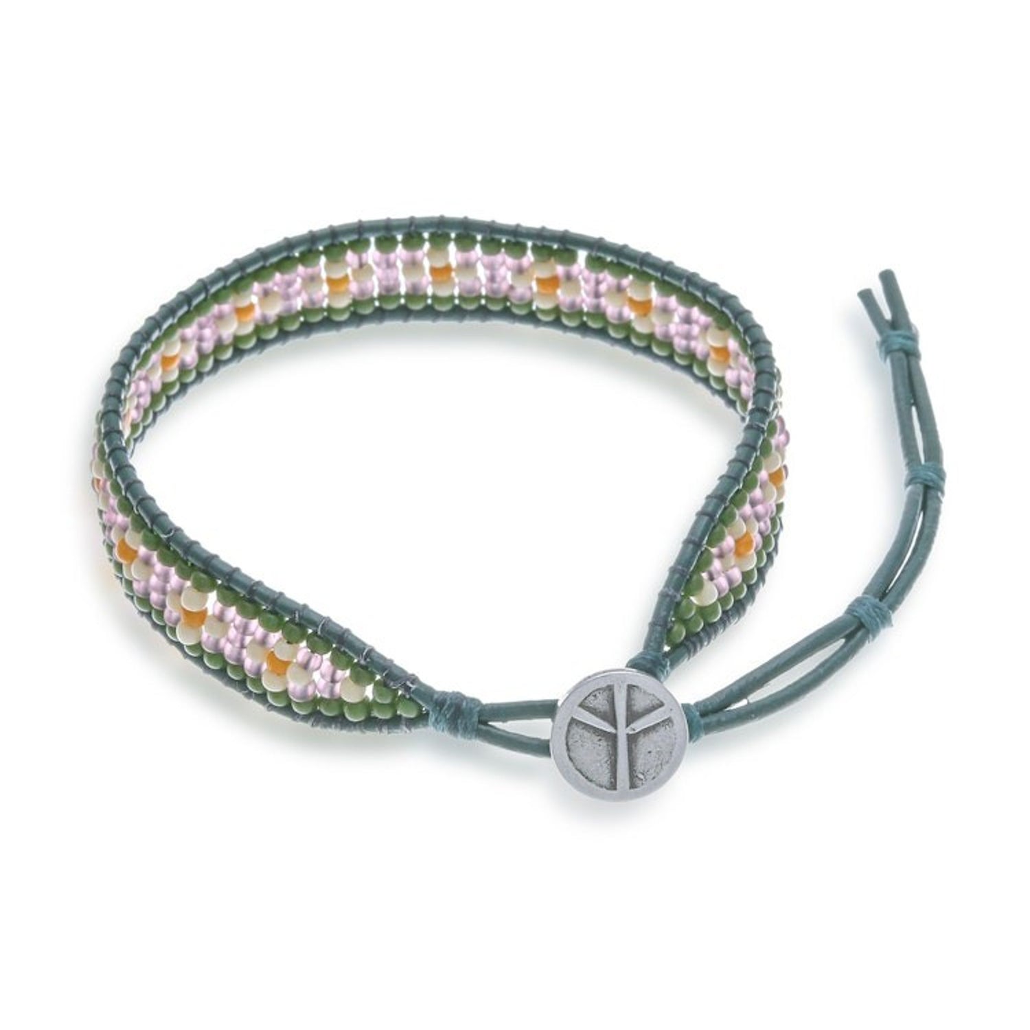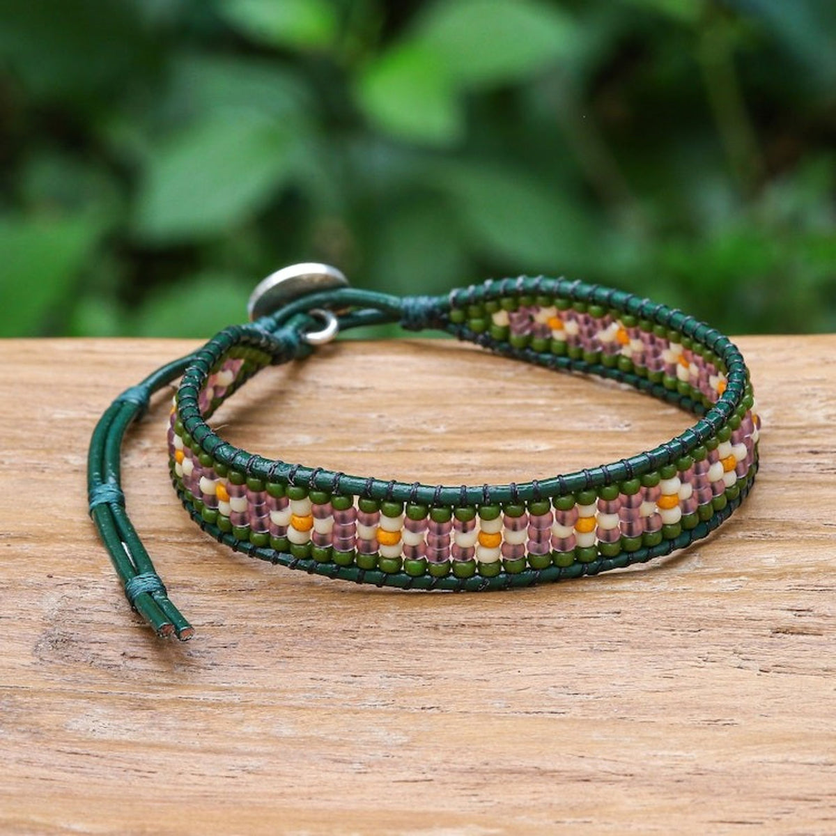This Green and Purple Glass Bead and Leather Wristband Bracelet by Siriporn Tongwat takes you to a peaceful forest with its palette of green, purple, ivory, and yellow hues. The wristband is crafted from glass beads and refined leather cords, all crowned by an adjustable button closure and a silver peace pendant.